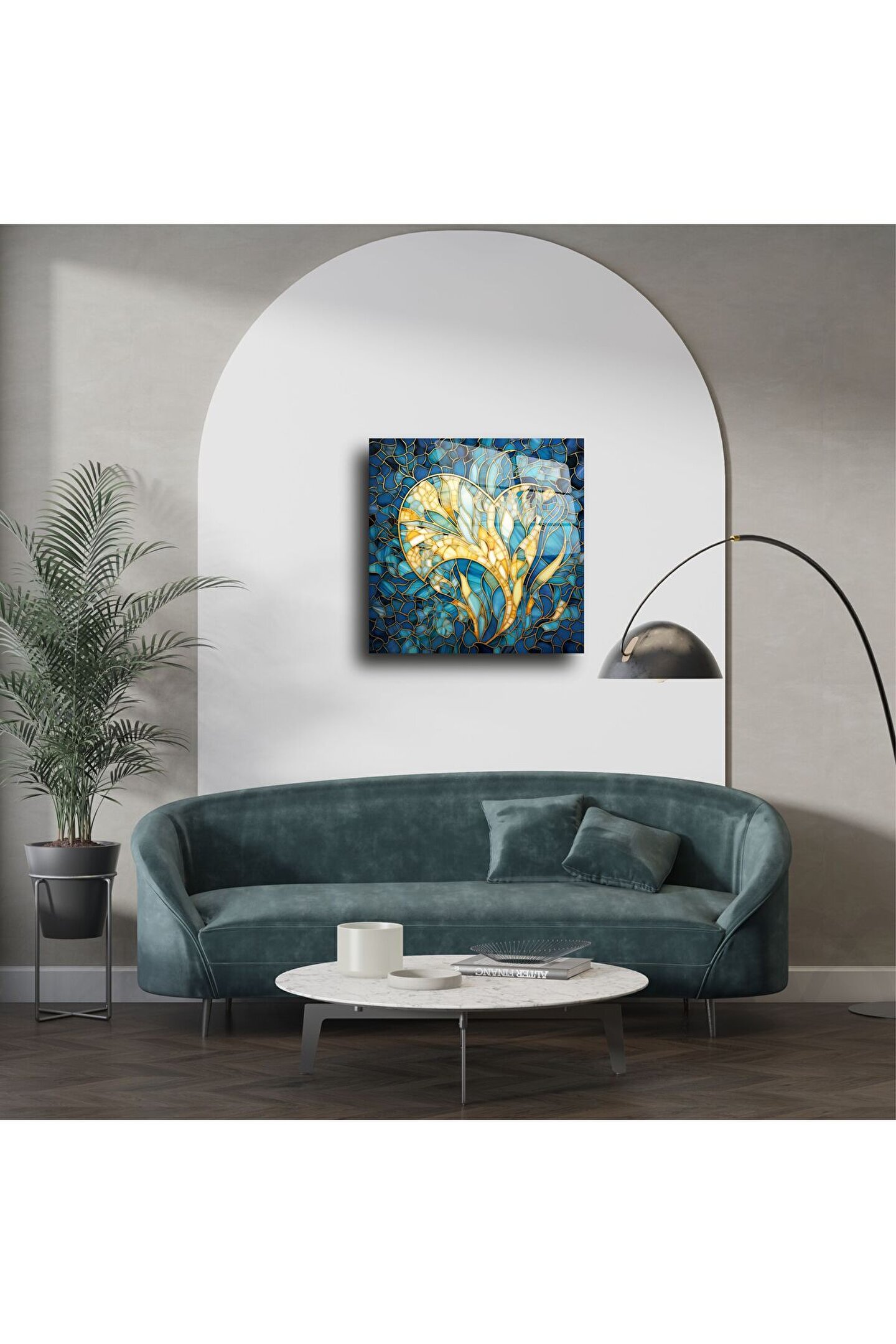 Aşkın ve sanatın birleştiği bu kalp desenli cam tablo, mavi ve altın tonların zarif uyumuyla evinizde duygusal bir atmosfer yaratır. Işıkla bütünleşen vitray efektli yapısı, romantizmi ve zarafeti aynı anda yansıtır.