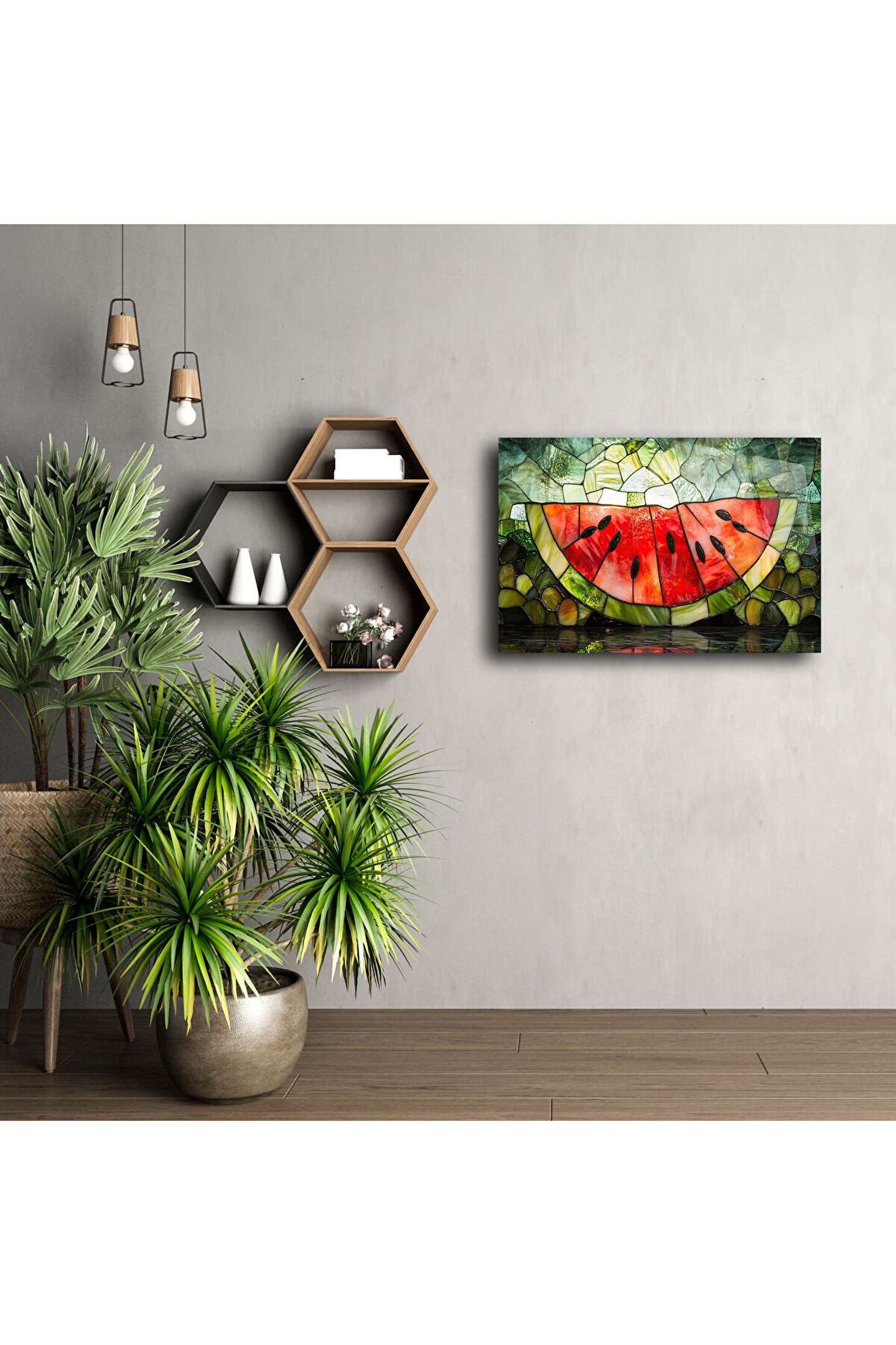 Yazın tazeliğini ve neşesini duvarlarınıza taşıyan bu Karpuz Dilimi temalı vitray cam tablo, yeşilin ve kırmızının canlı tonlarıyla ortama doğal bir ferahlık katıyor. Gerçek cam üzerine vitray etkili baskısıyla yazlık evlerin vazgeçilmez dekoratif parçası olmaya aday.
