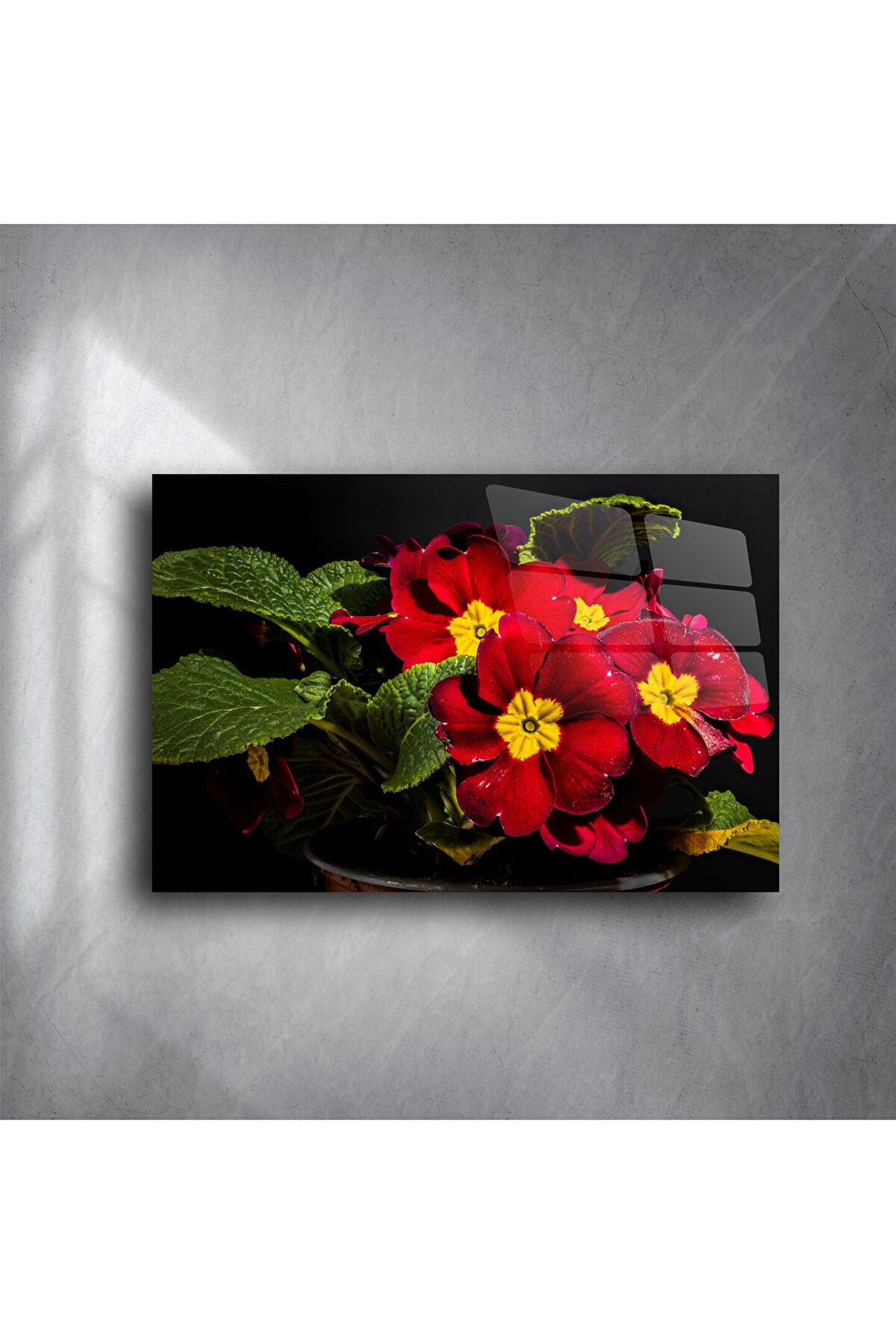 Zıtlığın büyüsüyle dikkat çeken bu cam tablo, kırmızı primula çiçeklerinin canlı tonlarını derin siyah arka planla buluşturuyor. Parlak cam yüzeyi sayesinde ışığı büyüleyici bir şekilde yansıtarak yaşam alanınıza sanatsal bir şıklık katıyor.