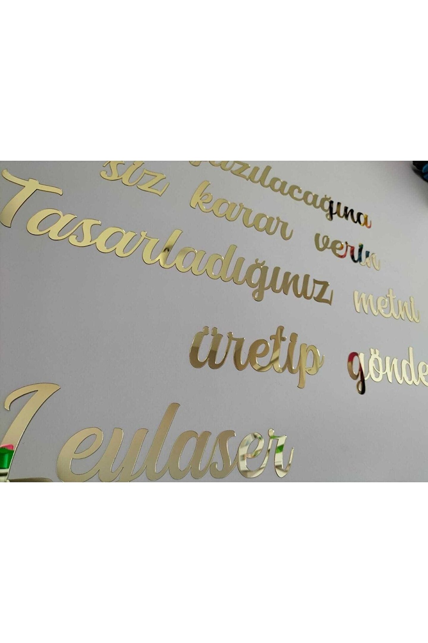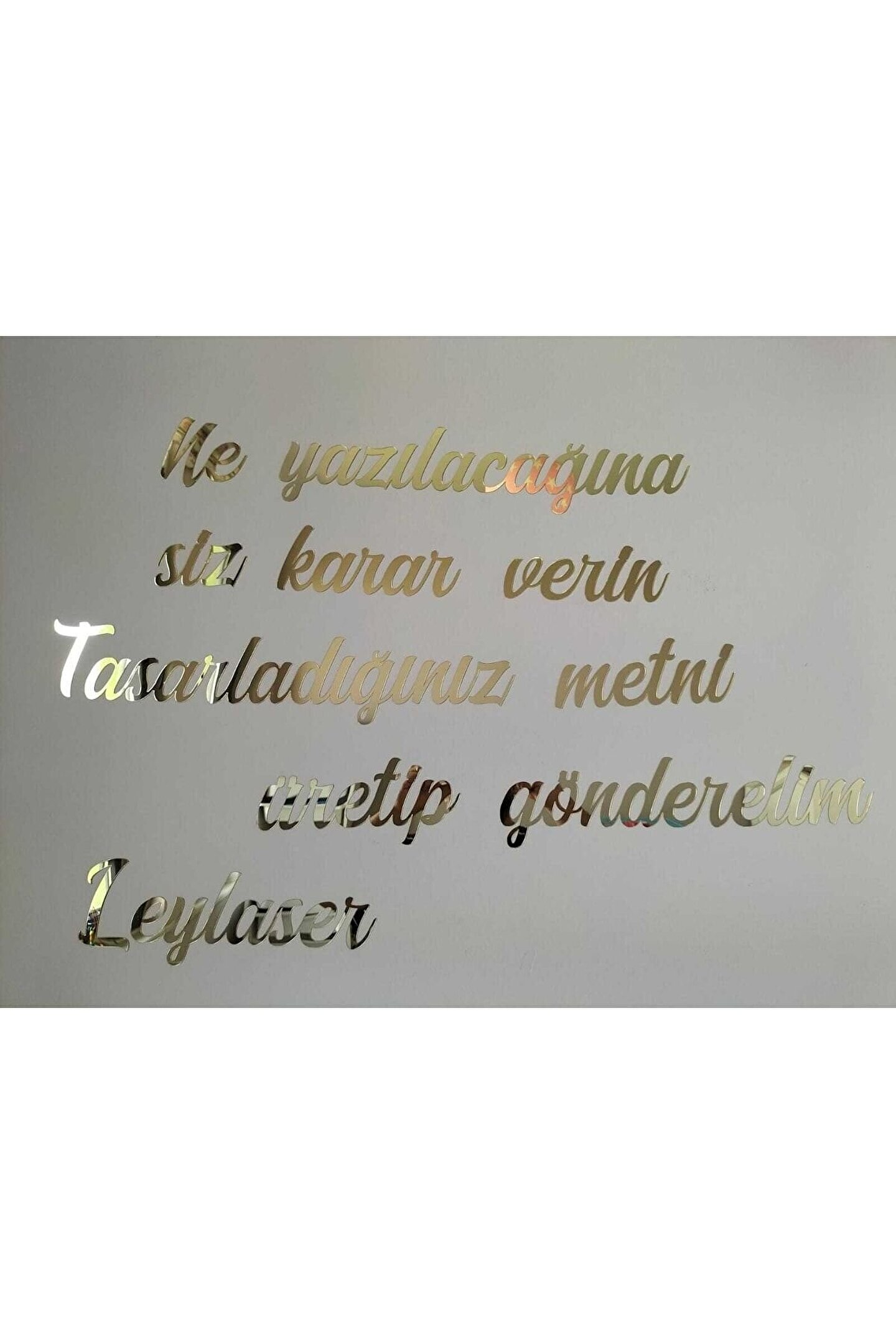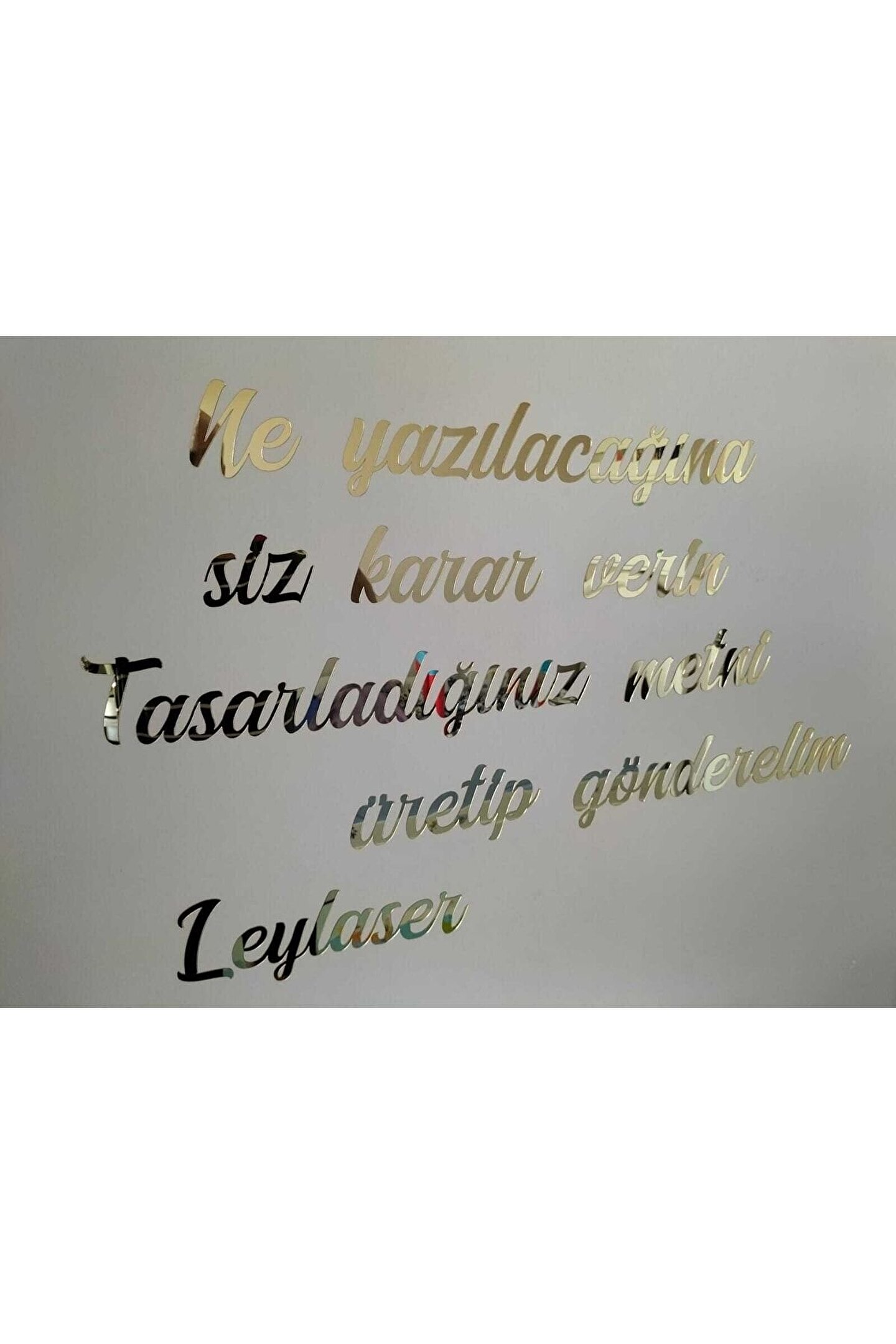 Ürünümüz 50 harf için geçerlidir.; Her 50 harfte 1 ürün almalısınız.; Küçük harfleri 1, Büyük harfleri de 3 saymalısınız.; Harf ölçüleri standarttır.; ölçüler ikinci resimde verilmiştir.; Ürünü satın aldıktan sonra ürün sorularından önce sipariş numaranızı ardından da yazdırmak istediğiniz yazıyı yazdırabilirsiniz.; Hiçbirşey belirtmezseniz resimdeki yazı stili ile gönderilir.; ama yazı tipini değiştirmek istiyorsanız lütfen bize ulaşın.; istediğiniz yazı tipi ismini belirtirseniz yardımcı oluruz.; FARKLI ÖLÇÜ VE EBATLAR İÇİN LÜTFEN BİZE ULAŞINIZ.; MARKA İSMİMİZİ İNTERNETTE ARATINCA İLETİŞİM BİLGİLERİMİZE ULAŞABİLİRSİNİZ.; İster kendi kelimeleriniz ister beğendiğiniz bir söz yada size ait bir şiiir olsun duvarınızda ya da bütün düz zeminlerde kullanabileceğiniz duvar yazınızı bize bildirin biz üretelim Hiçkimsede olmayan duvar dekorunuz olsun Size özel duvar yazınız ayağınıza gelsin :) 1 mm GOLD renk kendinden yapışkanlı aynalı pleksi malzeme ile Leylaser tarafından üretilmiştir.; Direk bantın korumasını çıkartıp duvara monte edebilirsiniz.; ; Her kelime ayrı bir parça olarak gelecektir.; ; İstediğiniz şekilde kombin edebilirsiniz.; ; Yazdırmak istediğiniz metni satıcı sorularından ya da ürün sorularından sipariş numaranızla birlikte bildirebilirsiniz.; ; Yazdırmak istediğiniz metinde yer alan harf sayısına göre fiyatlandırma yapılmaktadır.