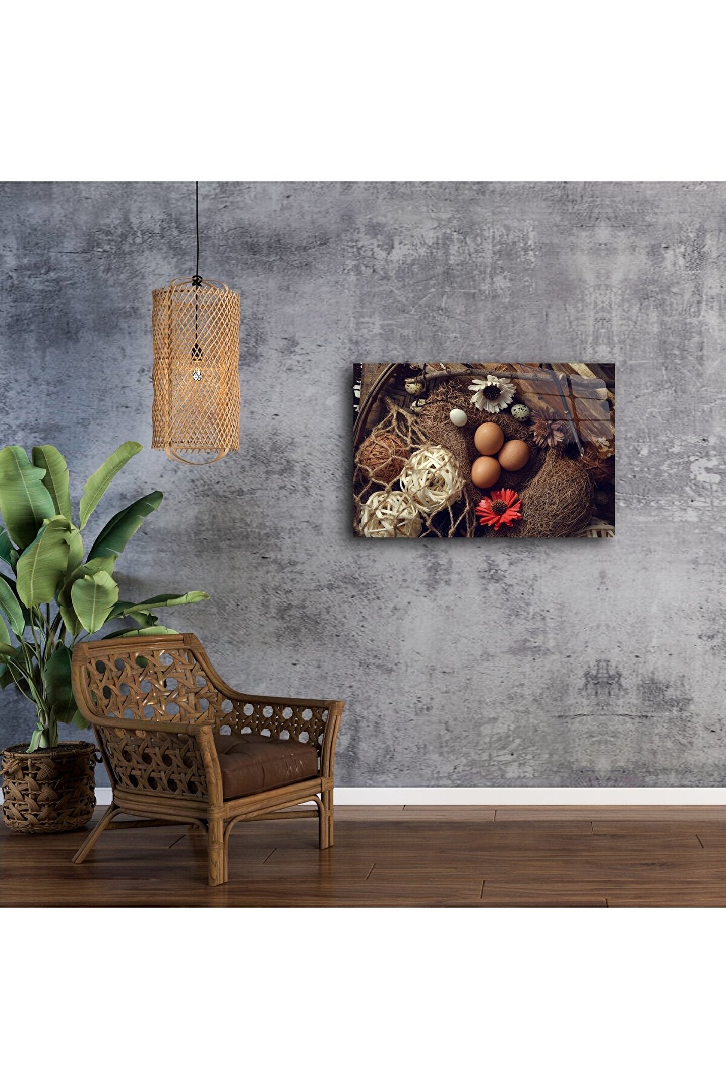 Rustik yaşamın sıcaklığını evinize taşıyın! Bu detaylı çiftlik temalı yumurta yuvası duvar posteri, doğal kahverengi yumurtalar, kurutulmuş çiçekler ve doku dolu hasır detaylarıyla huzur ve doğallık sunuyor. Arka plandaki eskitilmiş ahşap dokusu ise nostaljik bir hava katıyor.