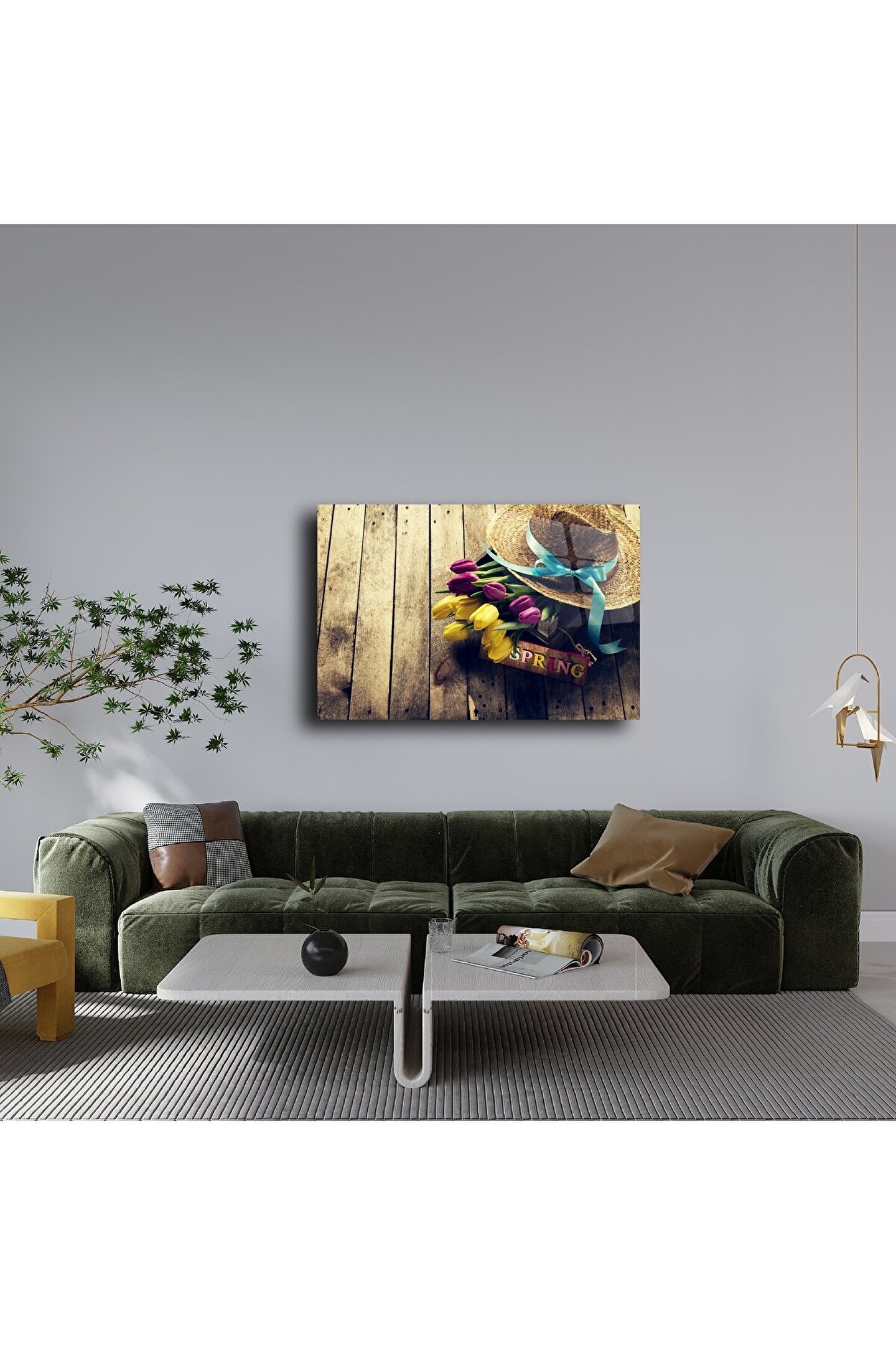 Baharın gelişini en sıcak haliyle anlatan bu cam tablo, mor ve sarı laleler, mavi kurdeleli hasır şapka ve vintage ahşap zemin dokusuyla iç açıcı bir kompozisyon sunar. Üzerindeki “Spring” yazısıyla mevsim geçişlerini evinizde hissettirirken, nostaljik havası ile yaşam alanlarınıza samimi bir dokunuş kazandırır.