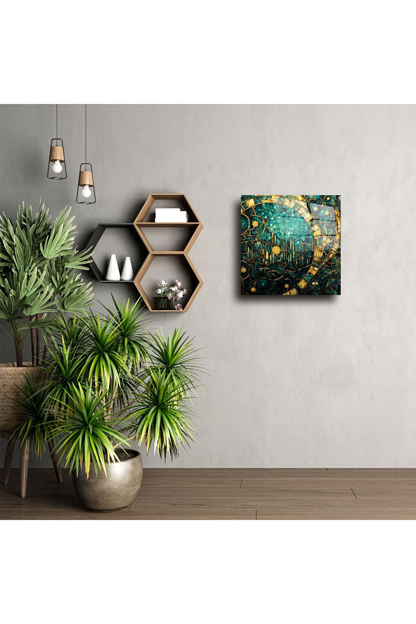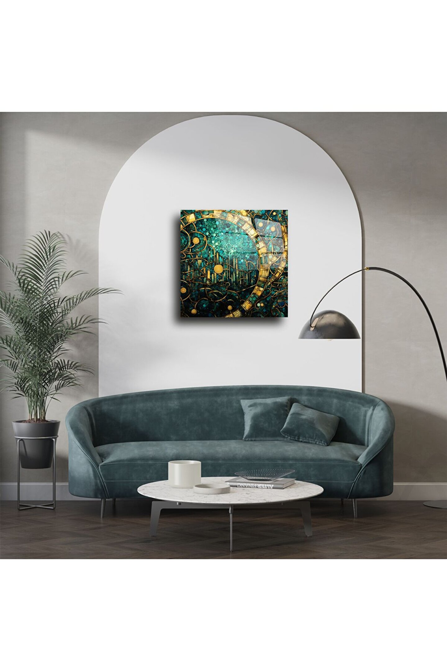 Parıltılı cam efektiyle işlenmiş bu modern cam mozaik tablo, zümrüt yeşili ve altın tonlarının zarif dansını sunar. Geometrik soyut tasarımı, her bakışta yeni detaylar keşfetmenizi sağlar. El işçiliği hissi veren mozaik görünümüyle evinize sofistike bir atmosfer kazandırır.