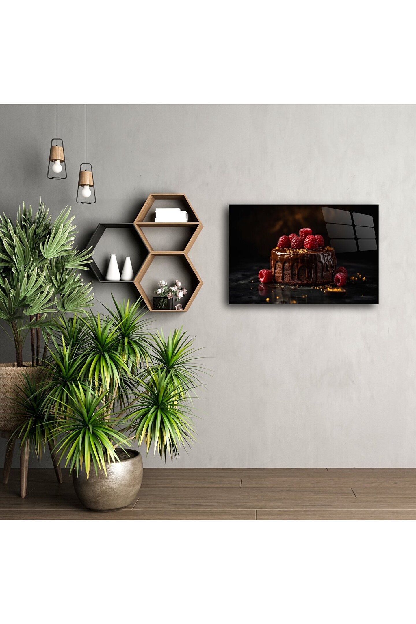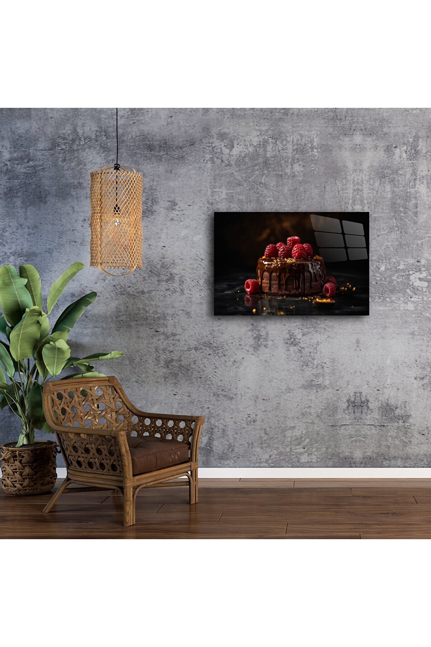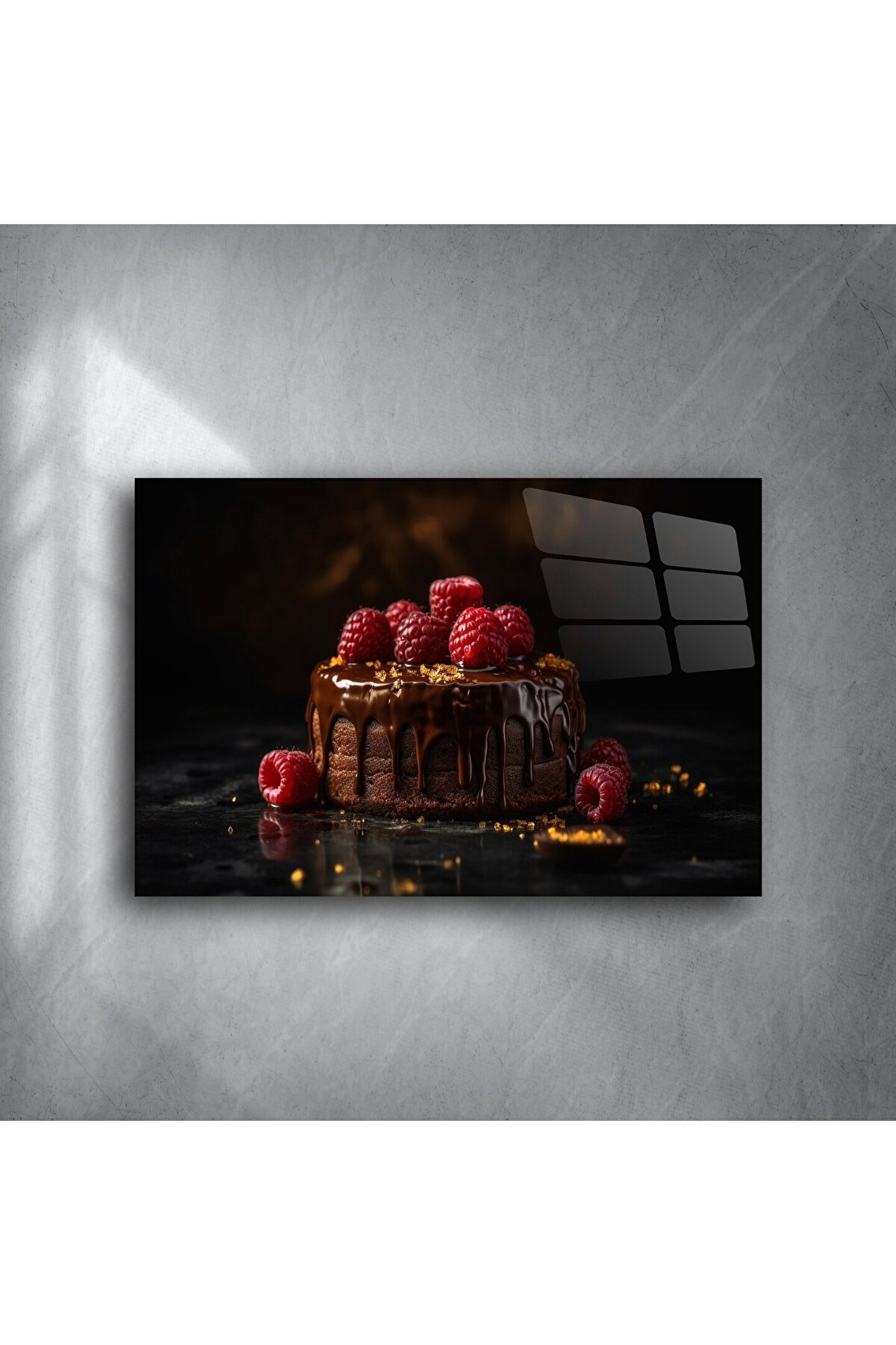 Çikolatalı ahududulu bu lüks cam tablo, mutfağınıza veya oturma odanıza sofistike ve iştah açıcı bir hava katmak için tasarlandı. Gerçek çikolata kaplı pasta ve canlı kırmızı ahududu detaylarıyla, her baktığınızda tatlı bir kaçamağa davet eden bir sanat eseri.