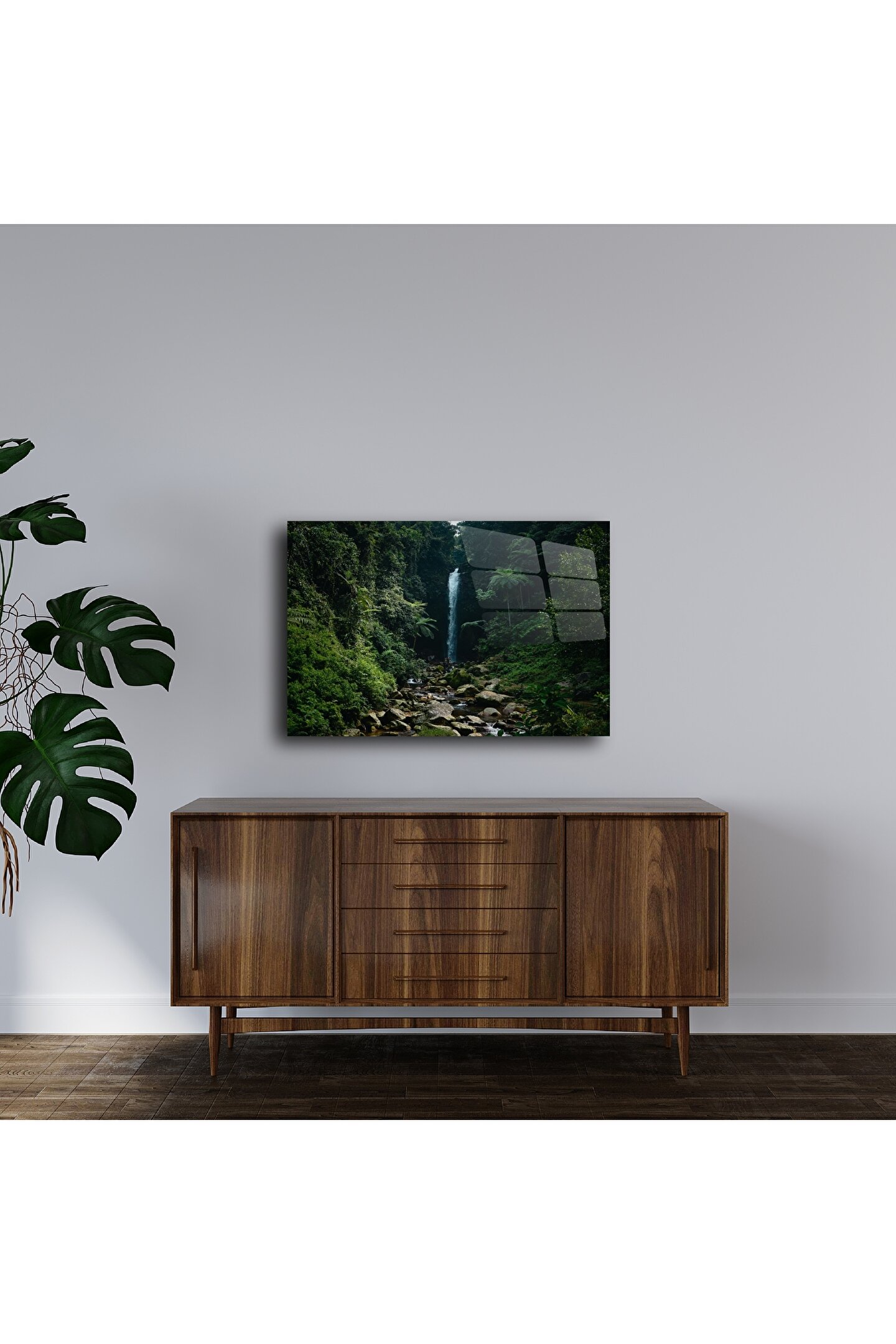 Doğanın büyüleyici gücünü evinize taşıyın. Bu yüksek parlak cam tablo, yeşilin tüm tonlarını içeren tropik bir orman ve zarif bir şelale sahnesiyle huzur ve estetiği bir araya getiriyor. Her detay, modern yaşam alanlarında dinginlik ve stil yaratmak için tasarlandı.