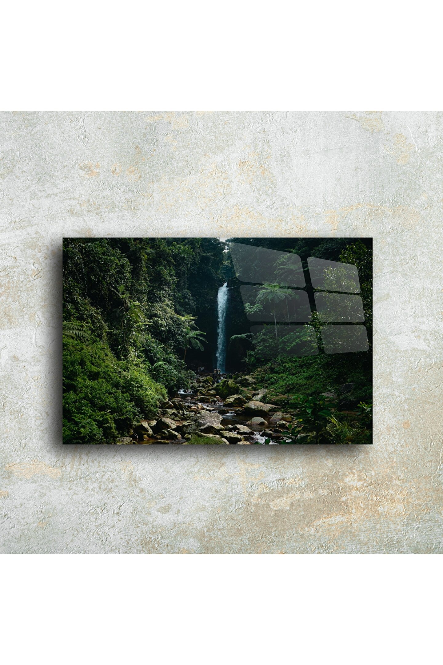 Doğanın büyüleyici gücünü evinize taşıyın. Bu yüksek parlak cam tablo, yeşilin tüm tonlarını içeren tropik bir orman ve zarif bir şelale sahnesiyle huzur ve estetiği bir araya getiriyor. Her detay, modern yaşam alanlarında dinginlik ve stil yaratmak için tasarlandı.