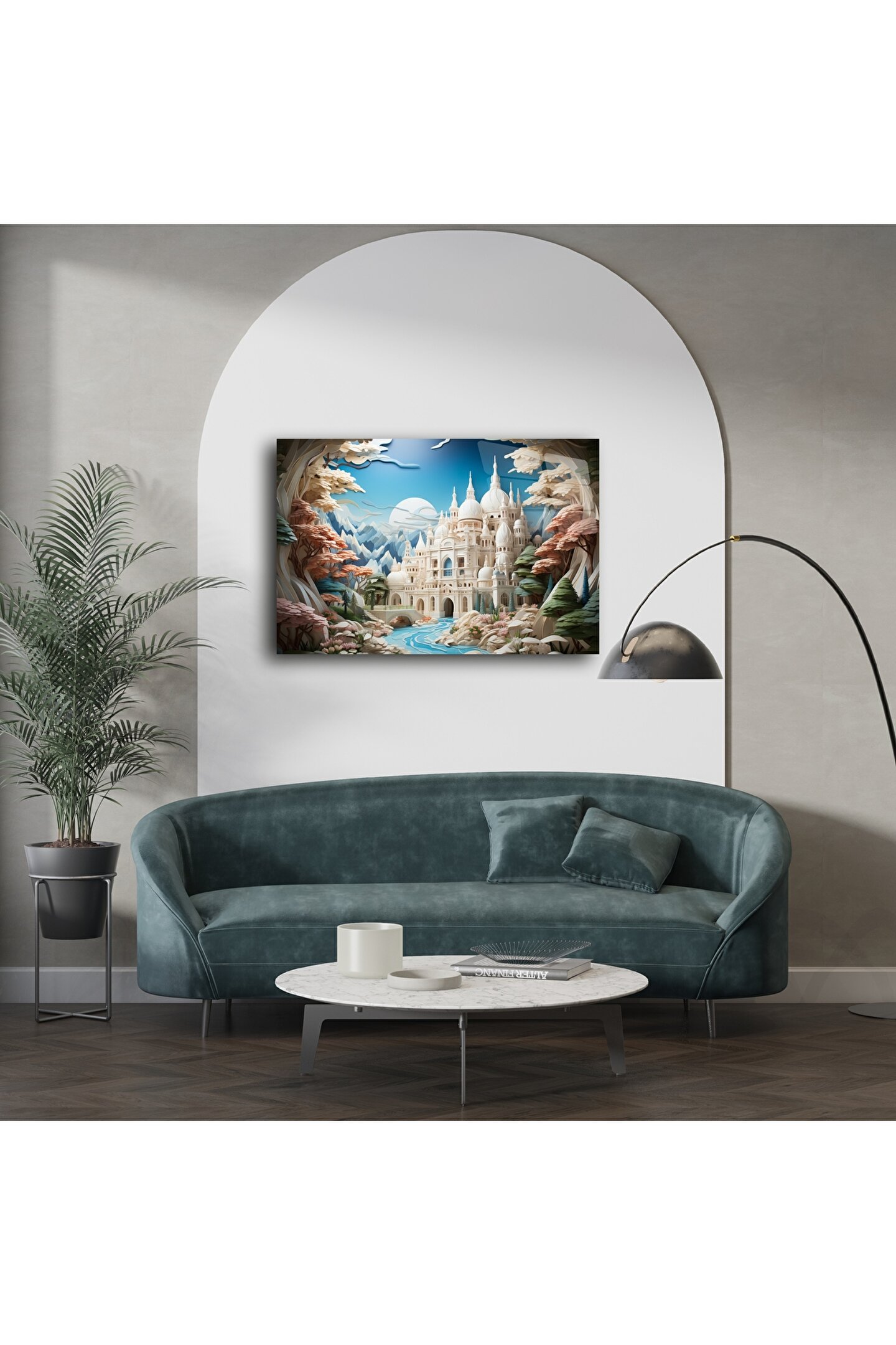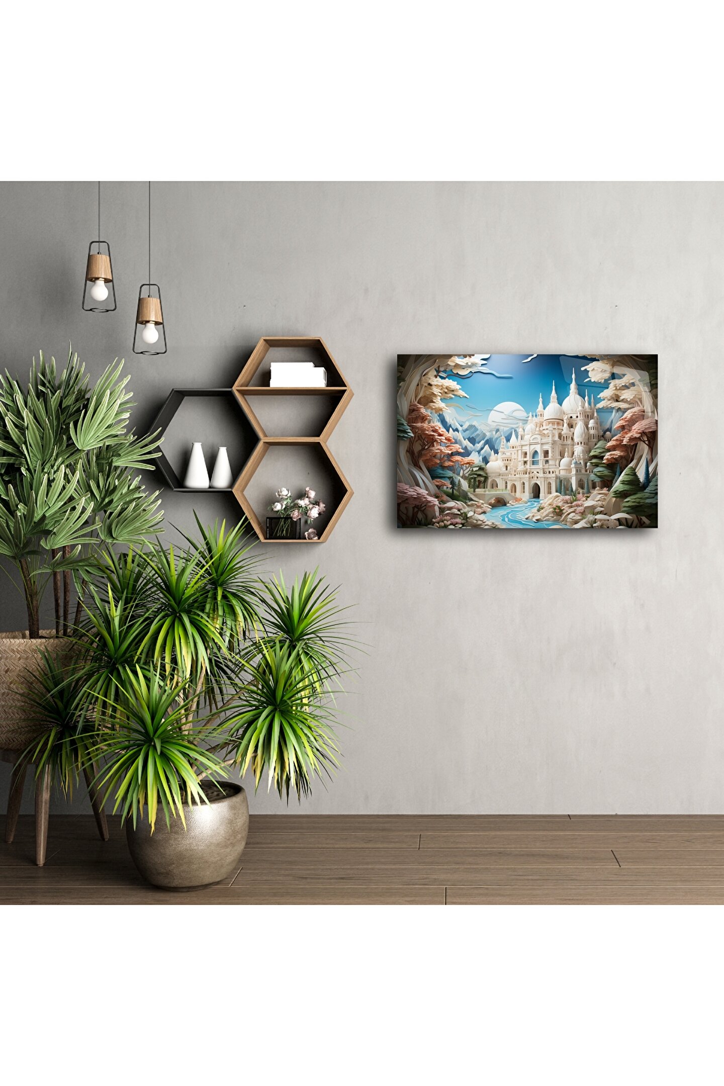 Soyut Şato Manzaralı Duvar Posteri, hayal gücünü harekete geçiren zarif detaylarla tasarlanmış büyüleyici bir dijital sanat eseridir. Büyülü bir vadinin kalbinde yer alan bu fantastik saray, pastel ve canlı tonların zarif birleşimiyle evinize masalsı bir hava katar.