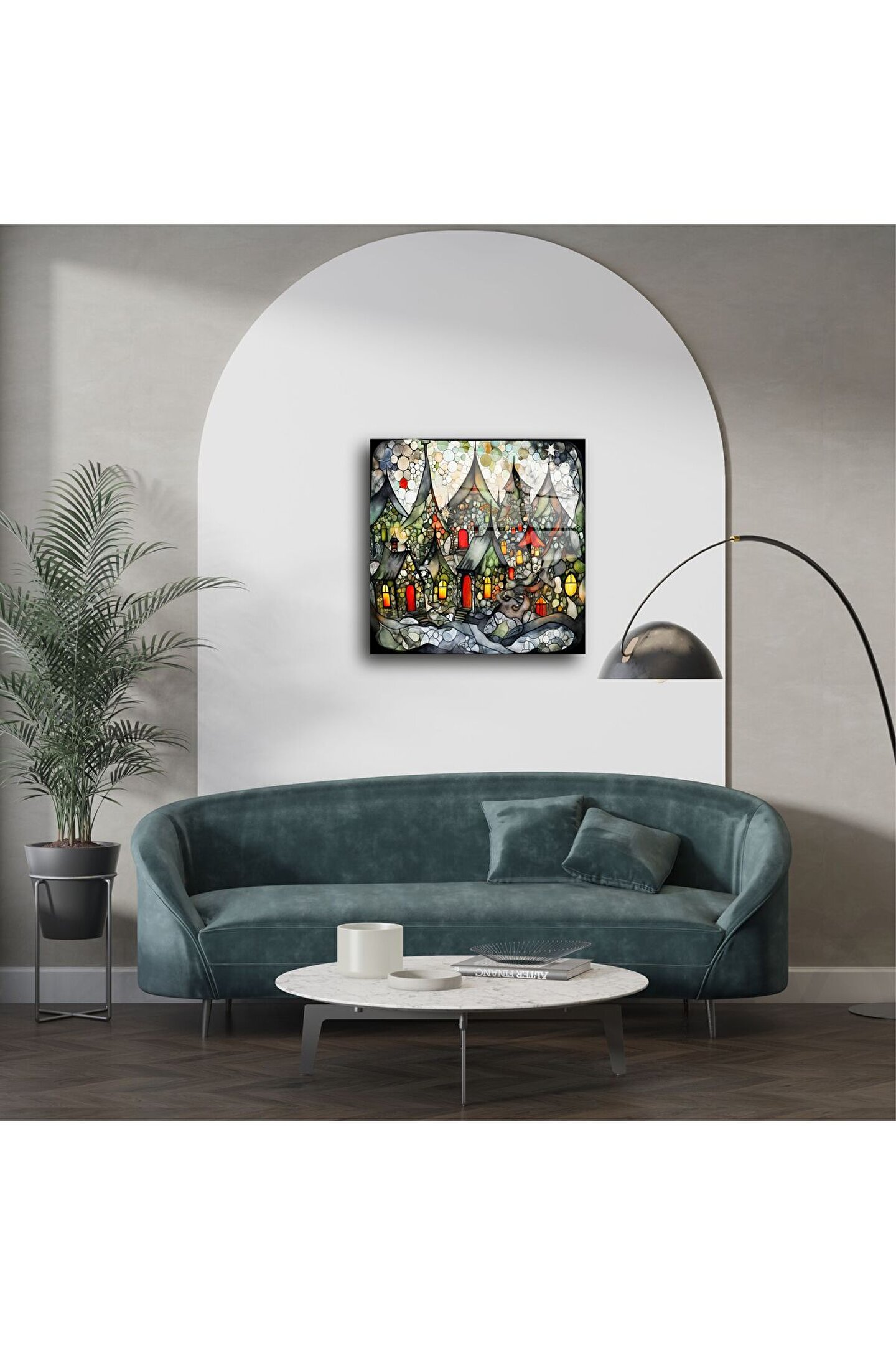 Bembeyaz karlar altında ışıkları yanan bir masal köyünü andıran bu cam tablo, vitray efektiyle kış mevsiminin sıcaklığını evinize getiriyor. Kırmızı kapılar, sarı pencereler ve detaylı çatılarla işlenmiş bu panel, çocukluğunuzdan bir anı gibi hissettiriyor.