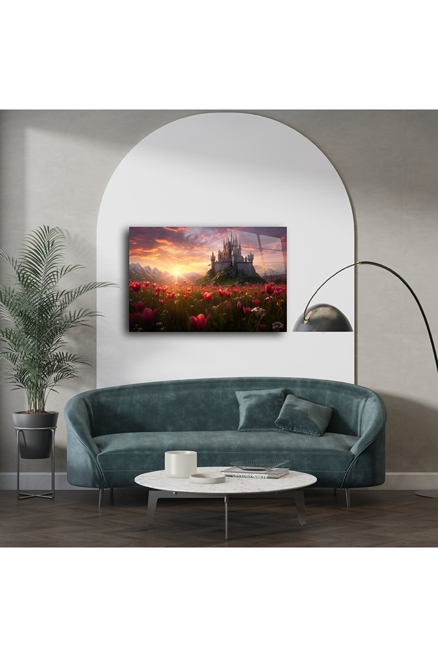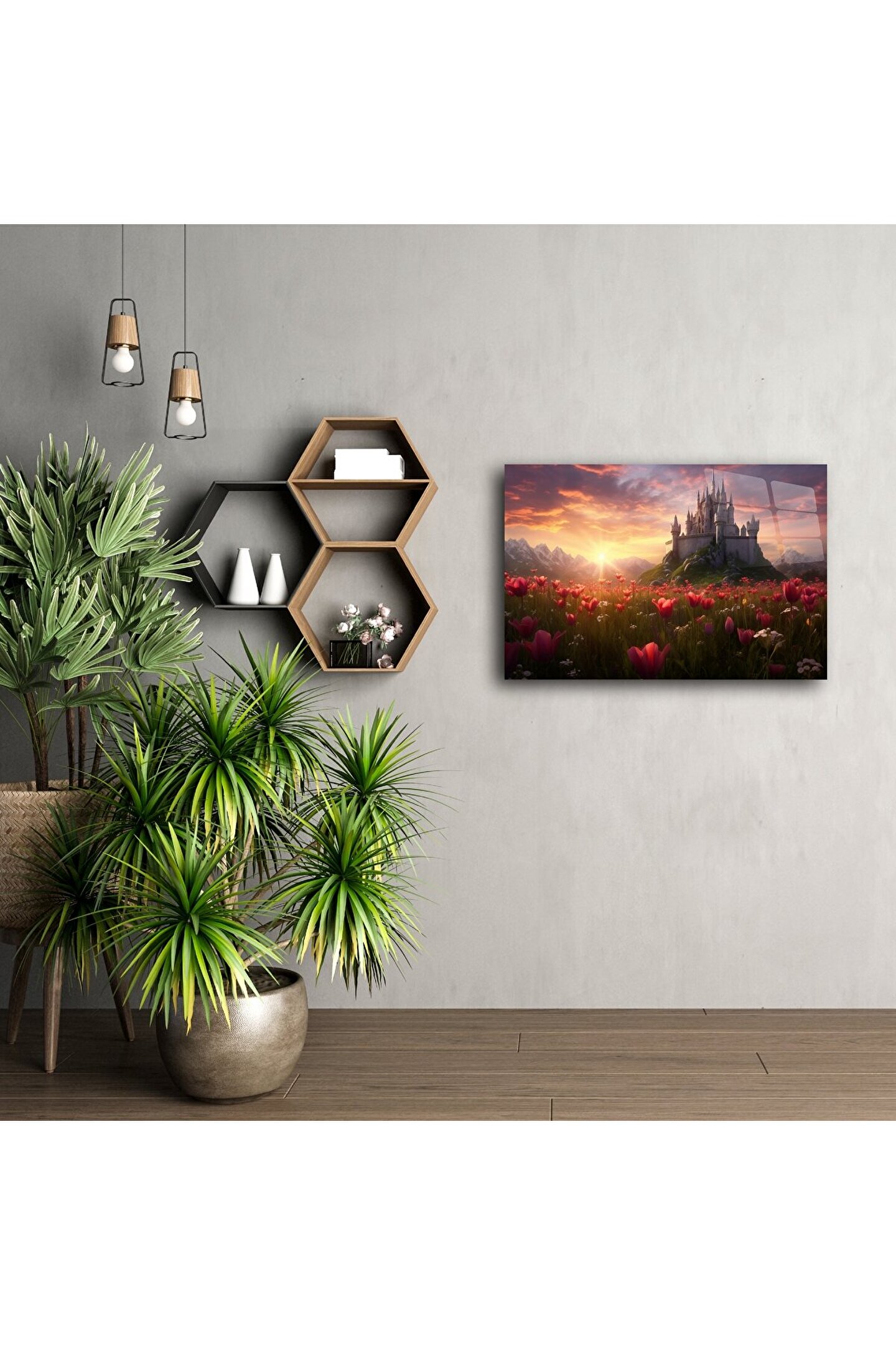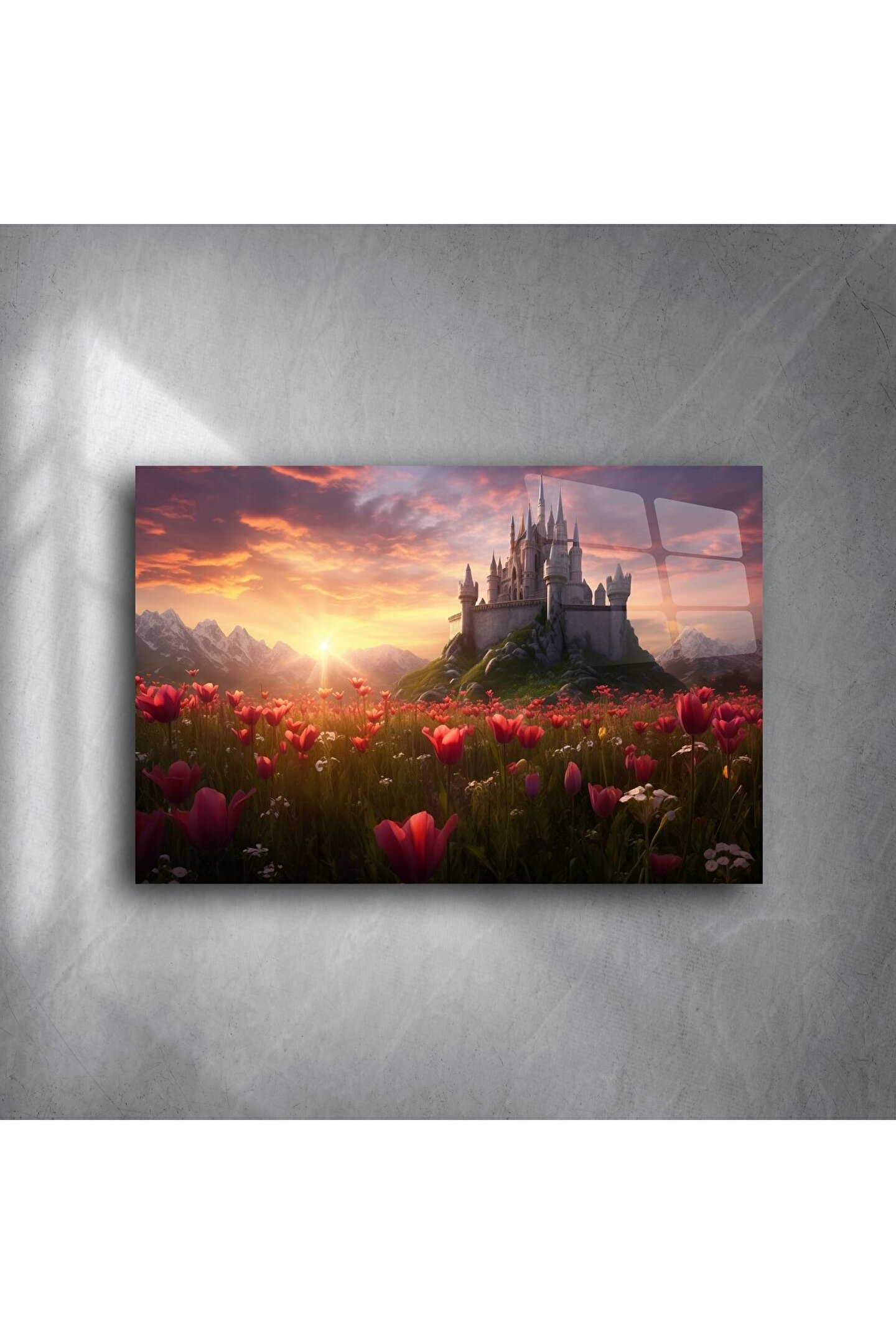 Bu cam tablo, hayal gücünüzün sınırlarını zorlayan bir manzarayı gözler önüne seriyor: Güneşin batarken renkleri tutuşturduğu gökyüzü, kırmızı lalelerle dolu bir tarla ve bir tepenin zirvesinde yükselen ihtişamlı bir şato. Fantastik evrenlerin duygusal derinliğini yaşam alanınıza taşıyın.