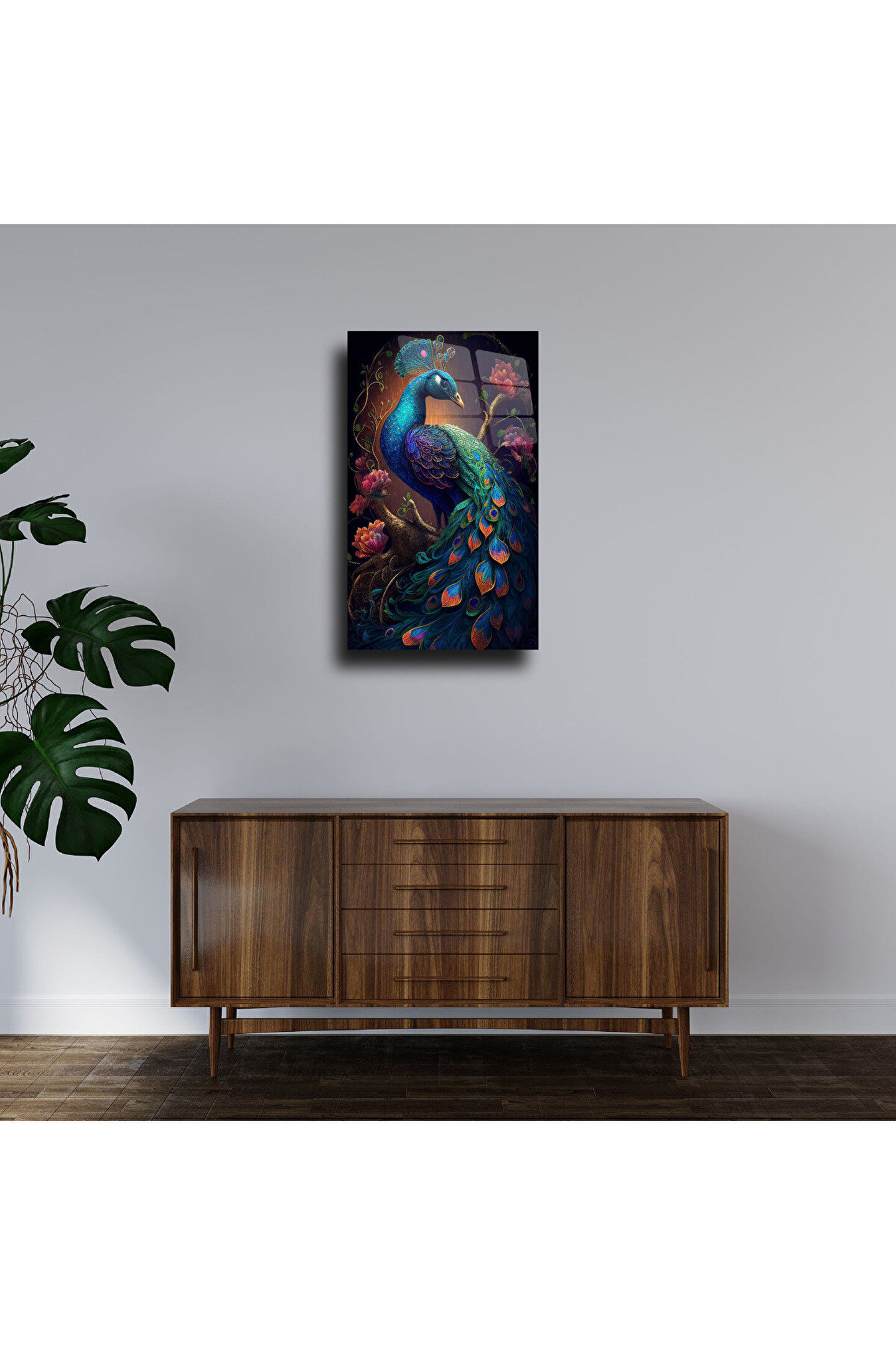 LEYLASER Mavi Tavus Kuşu Cam Tablo Duvar Dekoru