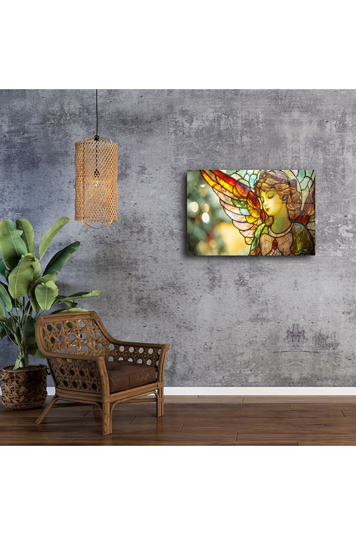 Bu narin melek figürüyle tasarlanmış vitray stil cam tablo, huzur ve zarafet arayan yaşam alanları için eşsiz bir sanatsal dokunuş sunuyor. Pastel tonlar ve cam üzerindeki ışık oyunları, her bakışta içsel bir dinginlik uyandırıyor.