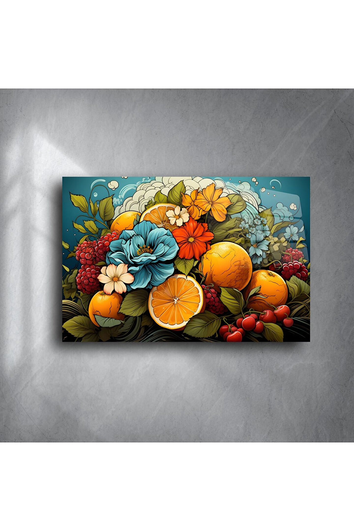 Bu büyüleyici cam tablo, portakal, kiraz ve ahududu gibi meyveleri zarif çiçeklerle bir araya getirerek yaşam alanınıza enerji ve doğanın ferahlığını taşıyor. Tropikal bir bahçeyi andıran canlı renkler, yazlık evler ve doğal temalı dekorasyonlar için mükemmel bir tercih sunuyor.