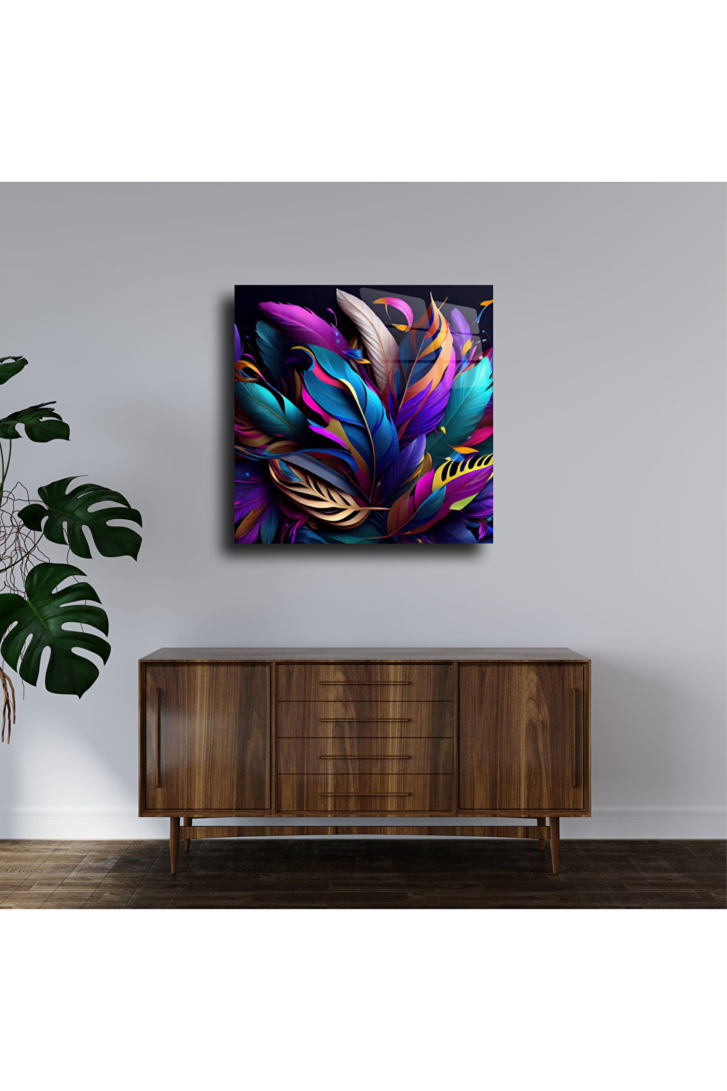 LEYLASER Mor Renk Tüyler ve Yapraklar Cam Tablo Duvar Dekoru