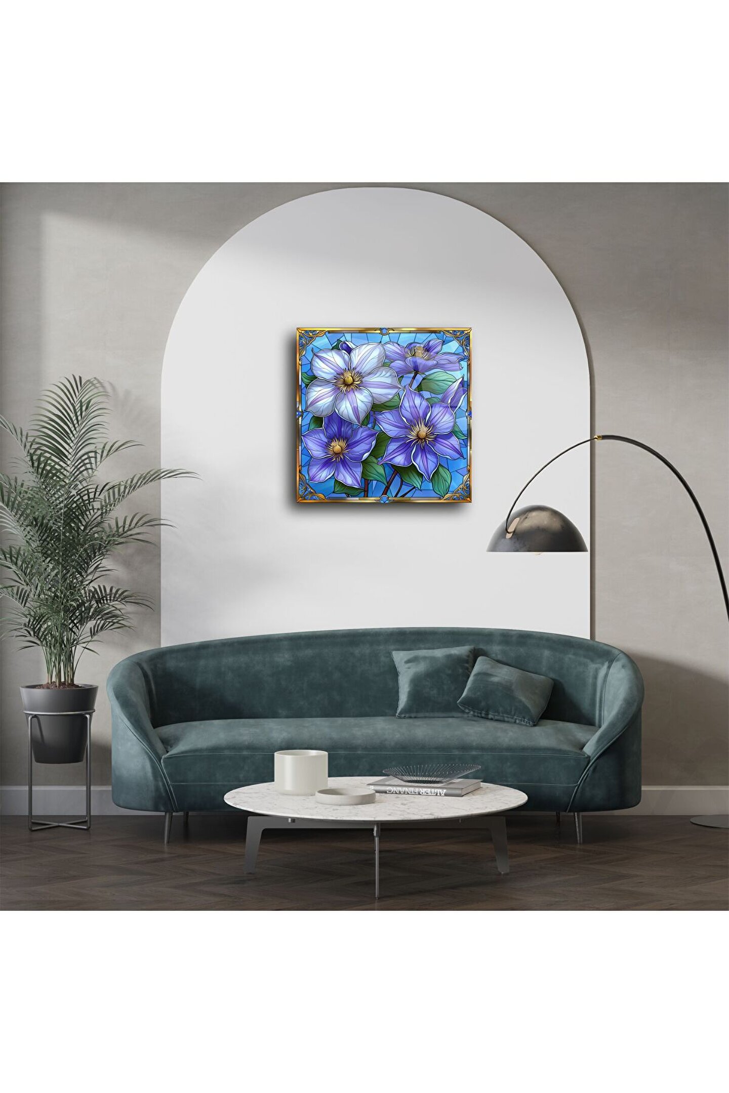 Bu eşsiz çiçek desenli cam tablo, mor ve mavi tonların ahengiyle evinizin duvarlarına sofistike bir dokunuş getiriyor. Altın detaylı zarif çerçevesi ve vitray sanatını andıran işçiliği ile hem klasik hem modern dekorlara uyum sağlar.