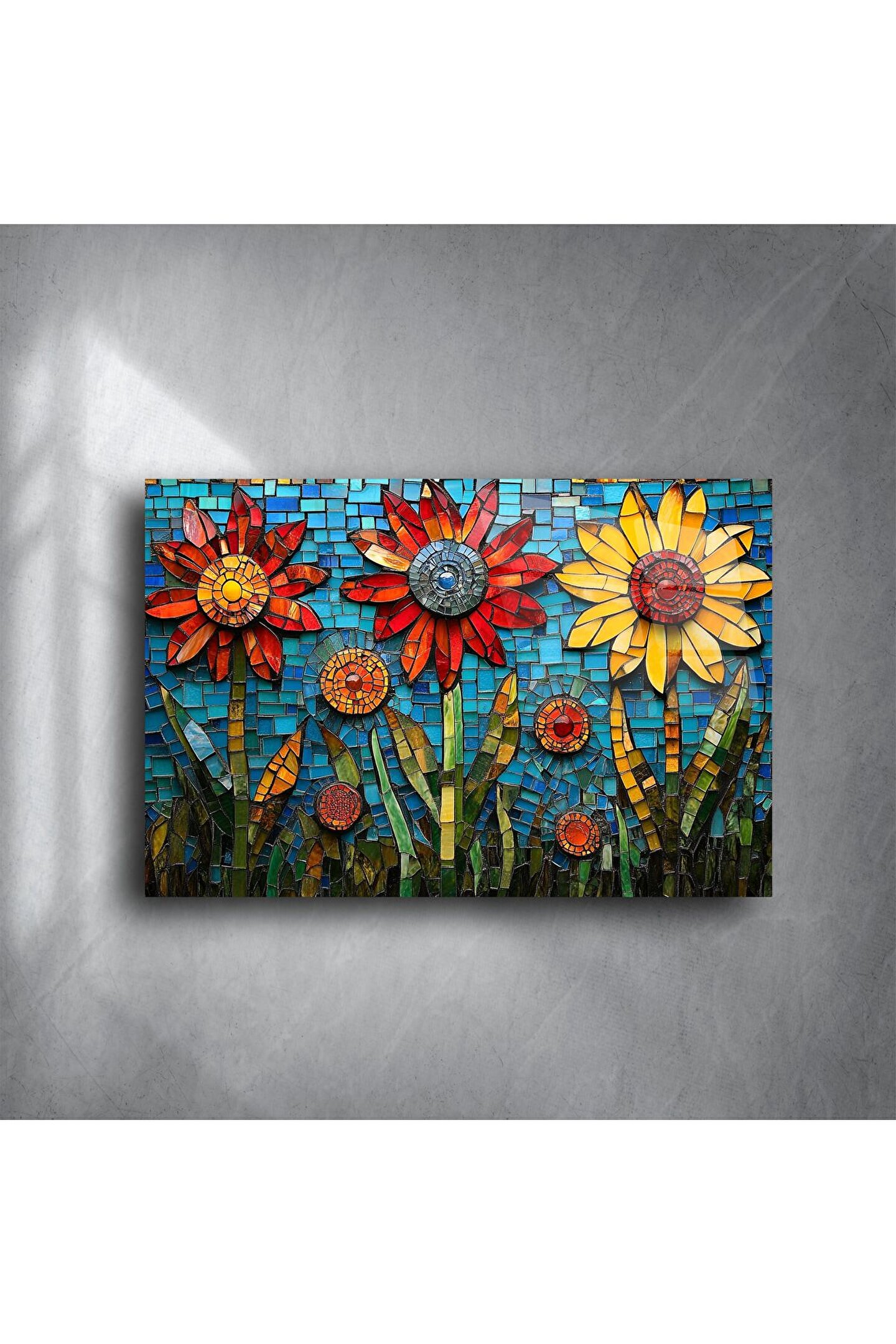 Canlı renklerin dans ettiği bu çiçek desenli mozaik cam tablo, yaşam alanınıza pozitif enerji ve sanatsal bir dokunuş katmak için tasarlandı. El yapımı cam mozaikler, mavi fon üzerinde sarı, kırmızı ve turuncu çiçeklerle adeta bir bahar bahçesini duvara taşıyor.