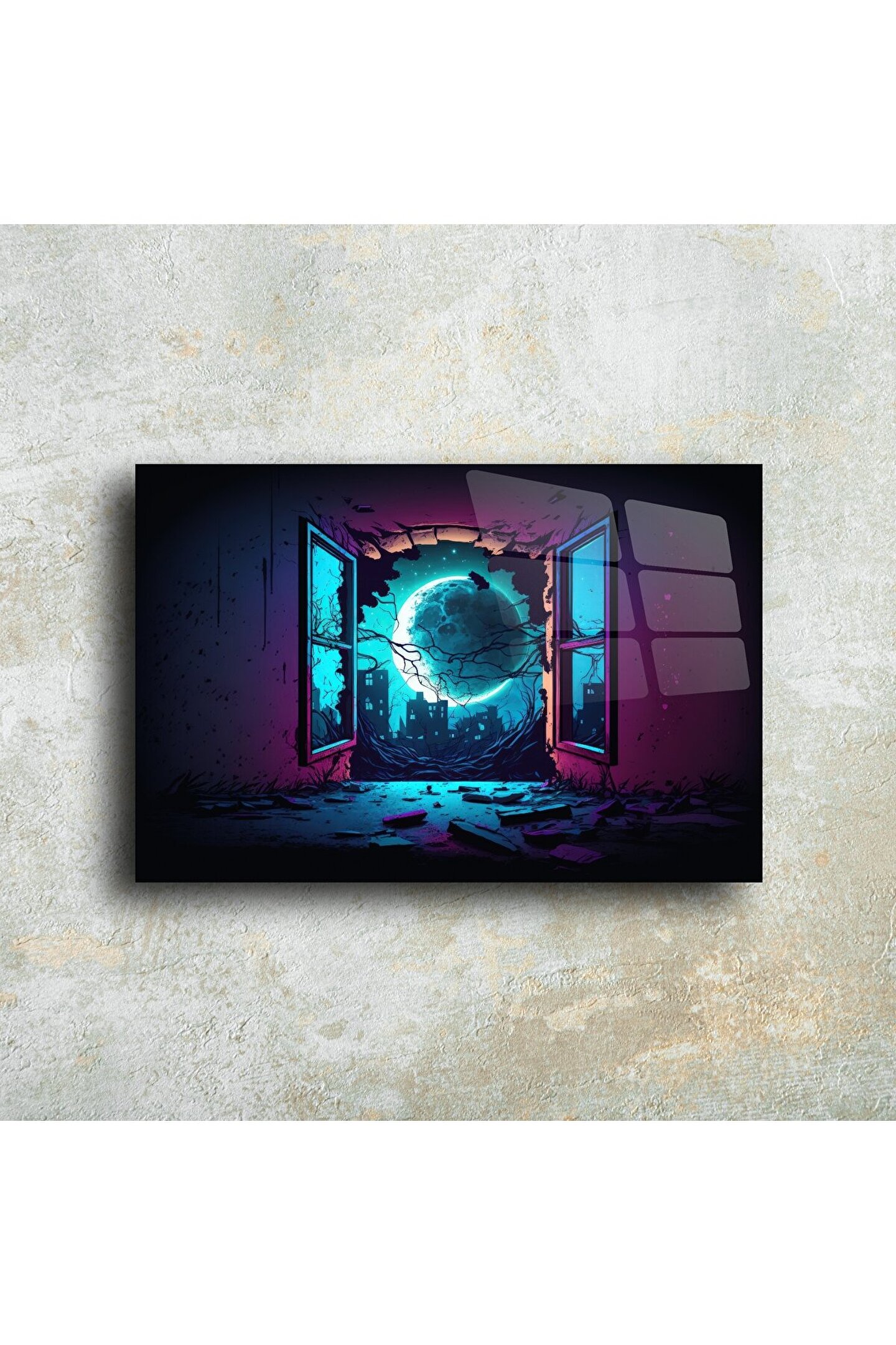 Bu eşsiz cam tablo, bir harabe odadan görünen büyüleyici neon mavi bir ay manzarasını fütüristik bir estetikle sunar. Pencereden uzanan bu sahne, izleyeni bilinmeyen bir evrende geceye doğru bir yolculuğa çıkarıyor.