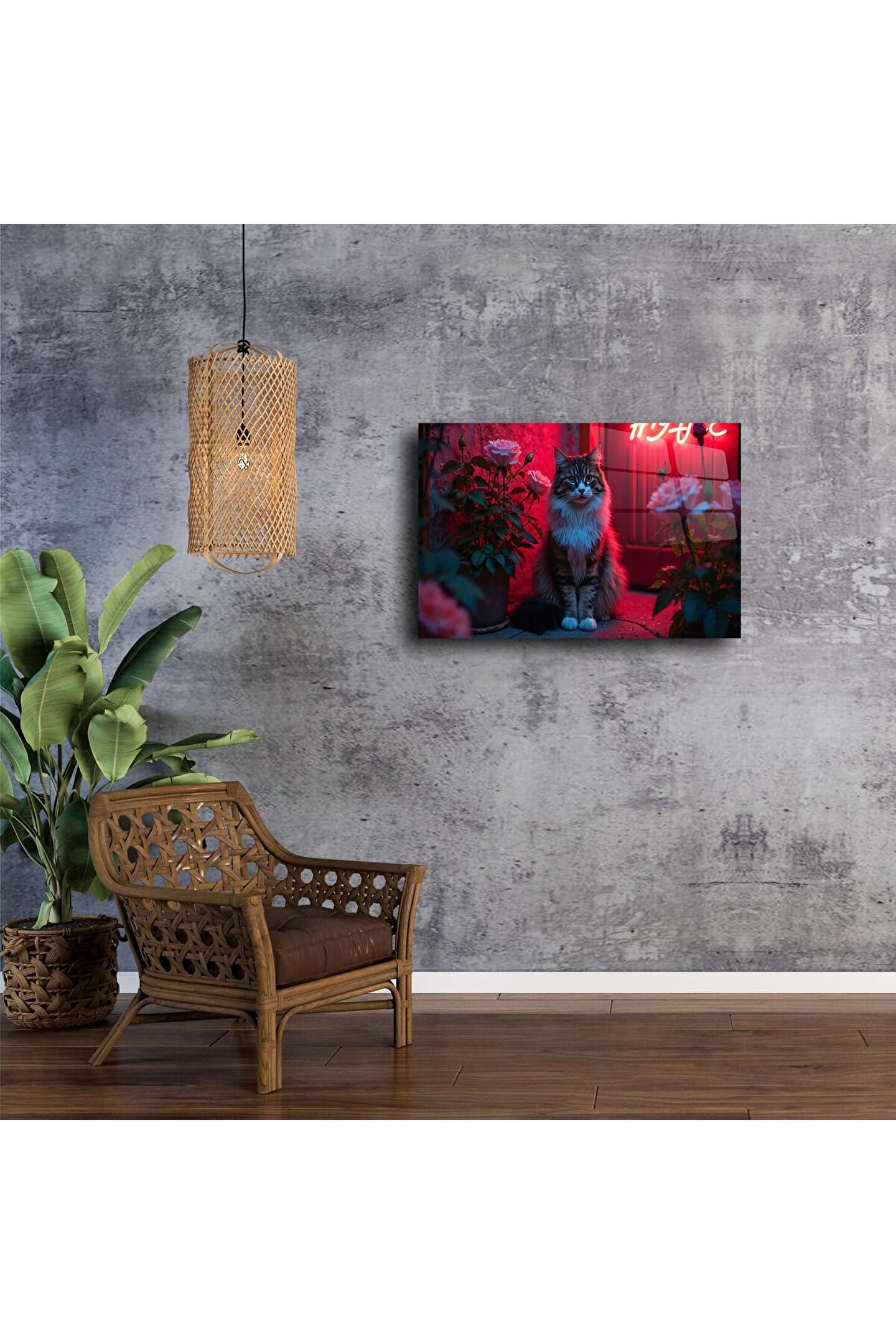 Güller, neon ışıklar ve bir kedi kadar karizmatik bir duruş... Bu gece neon ışığında tüylü kedi cam tablo, şehrin ışıltısını ve doğanın zarafetini tek karede buluşturur. Kontrast ve derinlik açısından zengin bu görsel, yüksek çözünürlüklü baskıyla temperli camüzerine işlenmiştir.