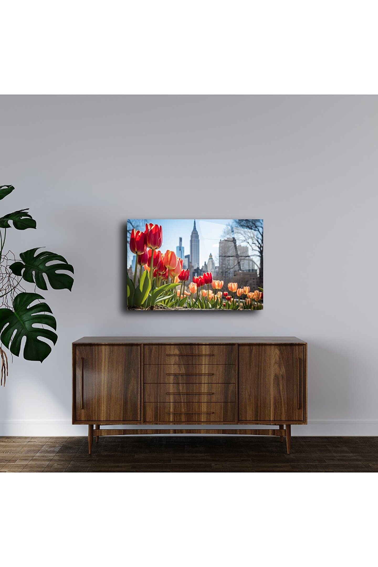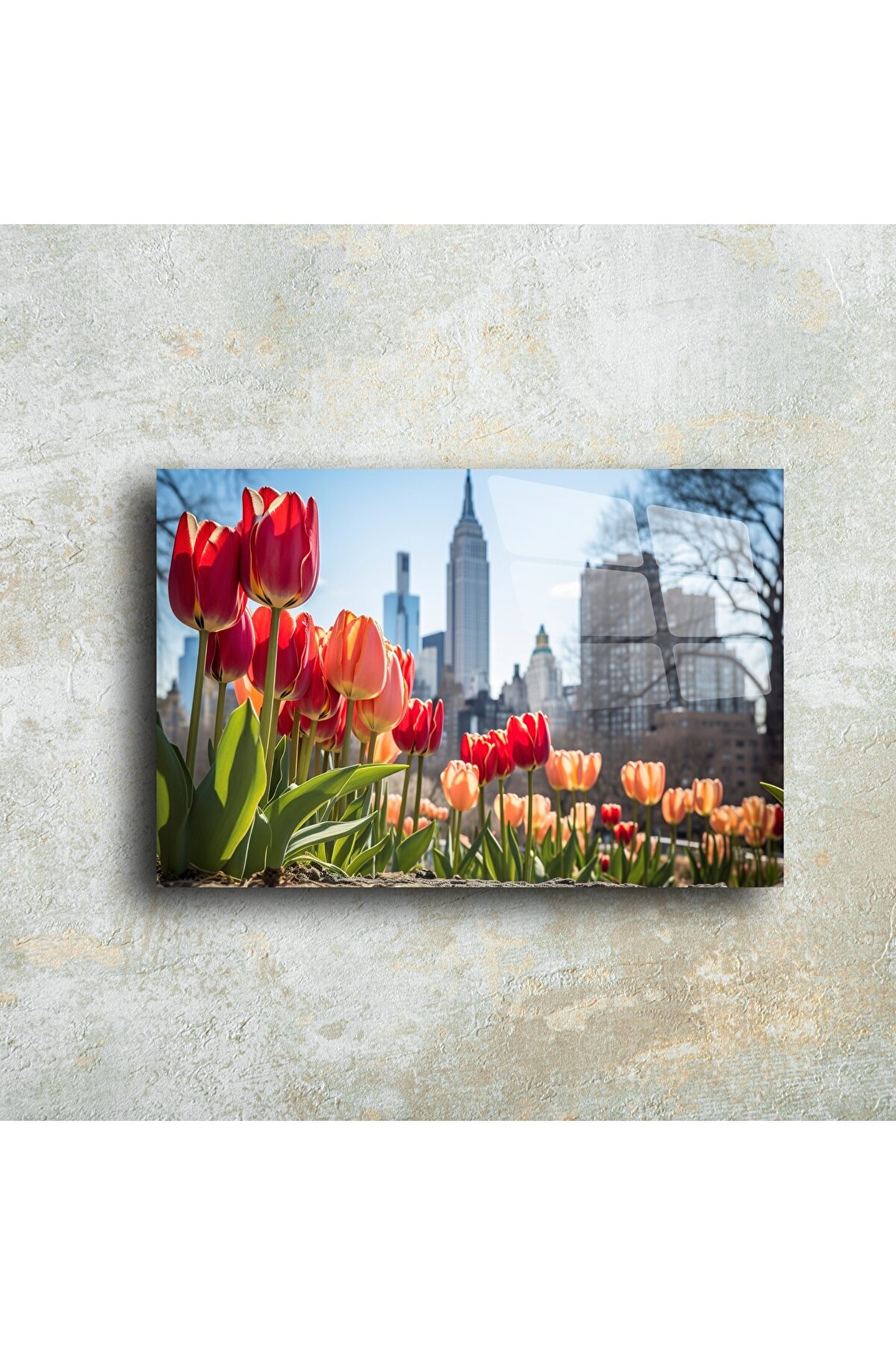 Şehir ve doğanın zarif buluşması: Bu cam tablo, renkli laleler eşliğinde yükselen New York siluetiyle hayat dolu bir kontrast sunar. Baharın taze enerjisi ile modern metropolün ikonik dokusu, evinize pozitif bir atmosfer katmak için buluşuyor.