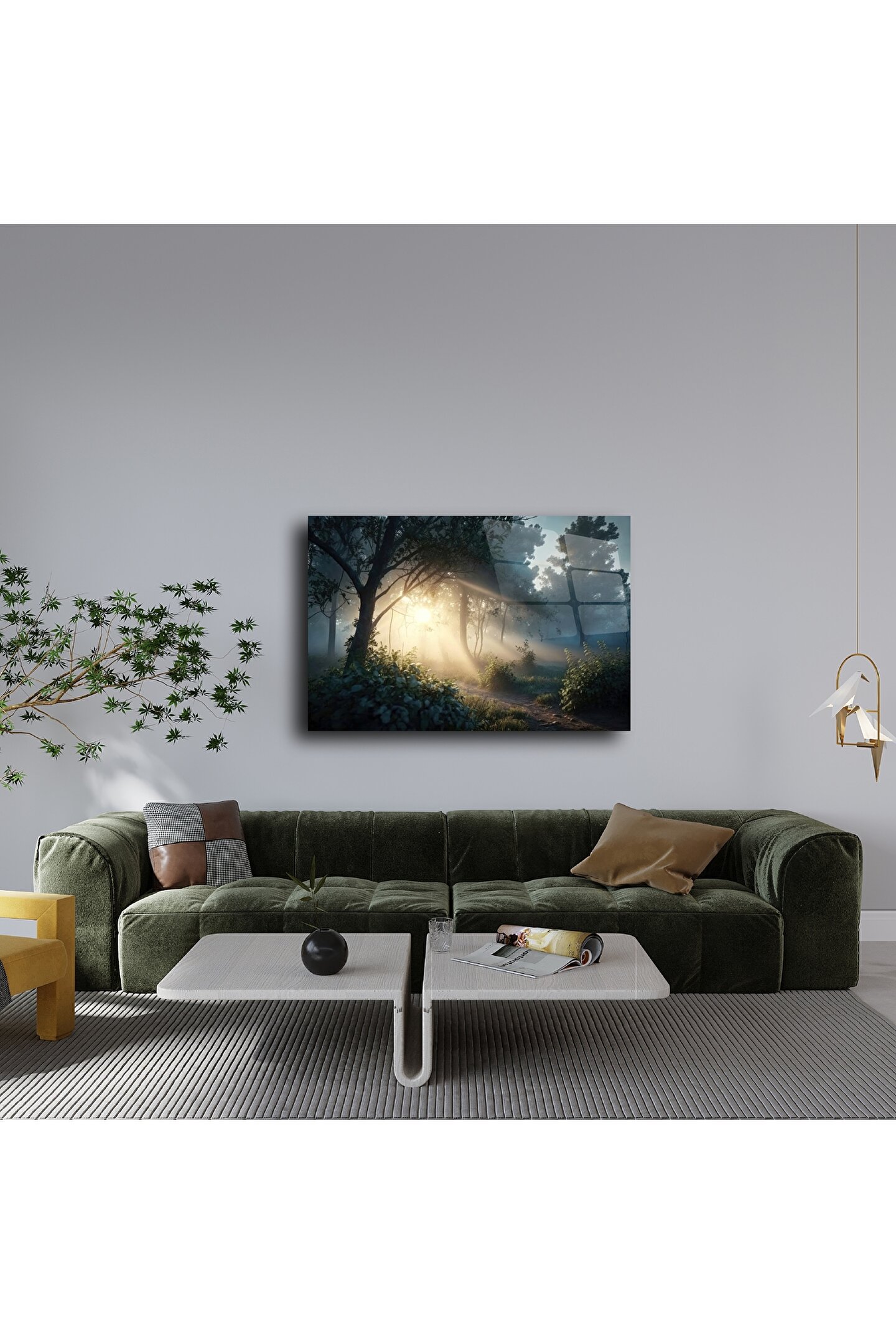 Orman Işık Patikası cam tablosu, güneş ışığının sabah sisiyle buluştuğu büyüleyici bir orman manzarasını cam üzerine yansıtır. Doğanın zarif dokunuşuyla evinize huzur, tazelik ve ilham dolu bir atmosfer kazandırır.
