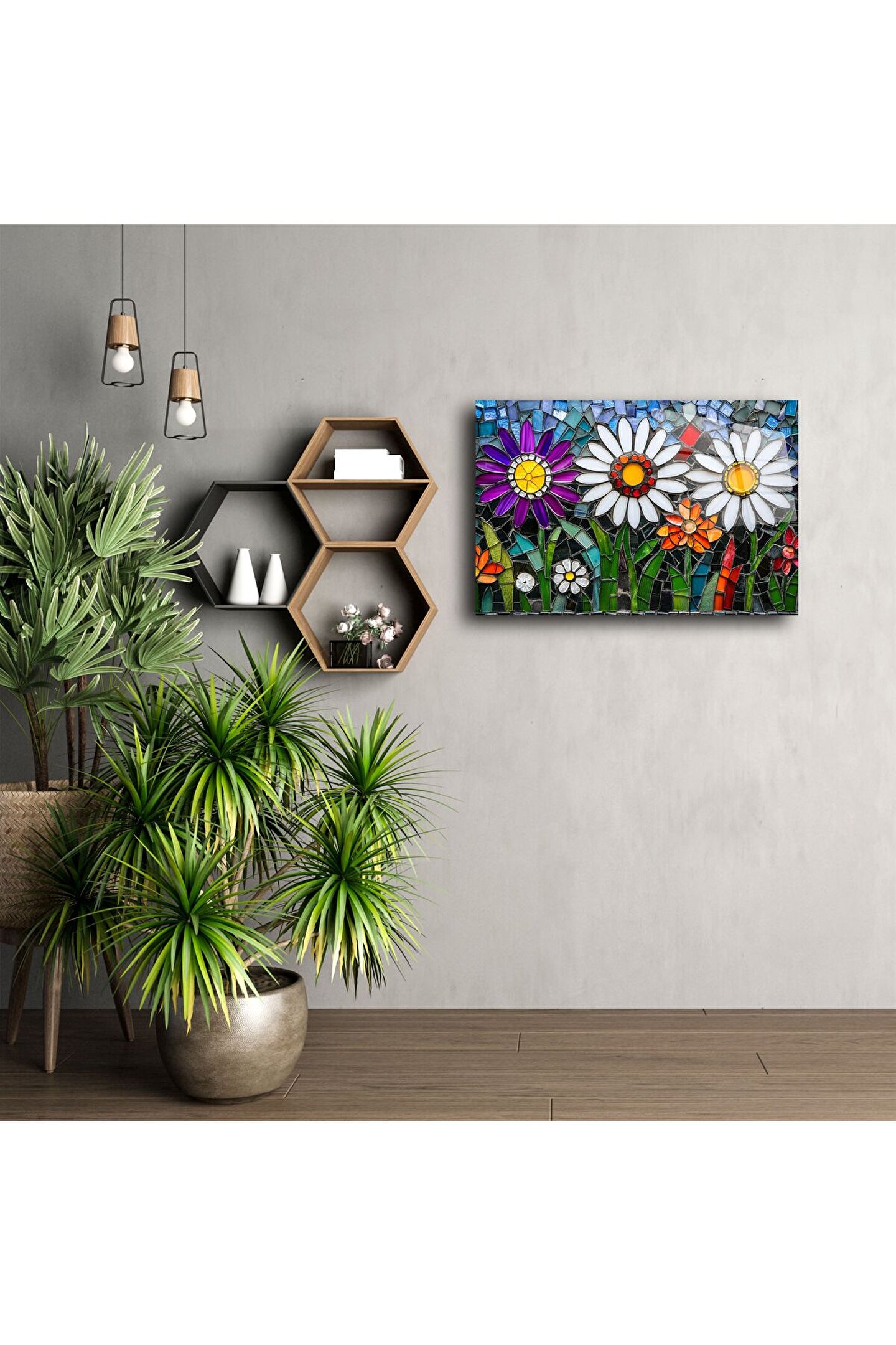 El işçiliği cam parçalarıyla hazırlanmış olan bu tablo, ışığı yansıtan yüzeyi sayesinde gün ışığında adeta çiçek açar. Özellikle salon, oturma odası, koridor ve balkon duvarları için göz alıcı bir seçimdir.