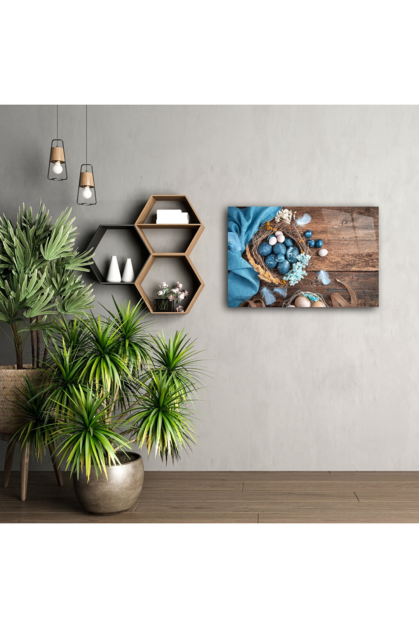 Doğal rustik dokunuşlarla tasarlanmış bu eşsiz duvar posteri, Paskalya temalı zarif mavi yumurtalar, çiçekler ve hasır detaylarıyla pastoral bir atmosfer yaratır. Gerçekçi ahşap dokusu ve zarif renk paletiyle mekanınıza huzur, doğallık ve bahar neşesi katın.