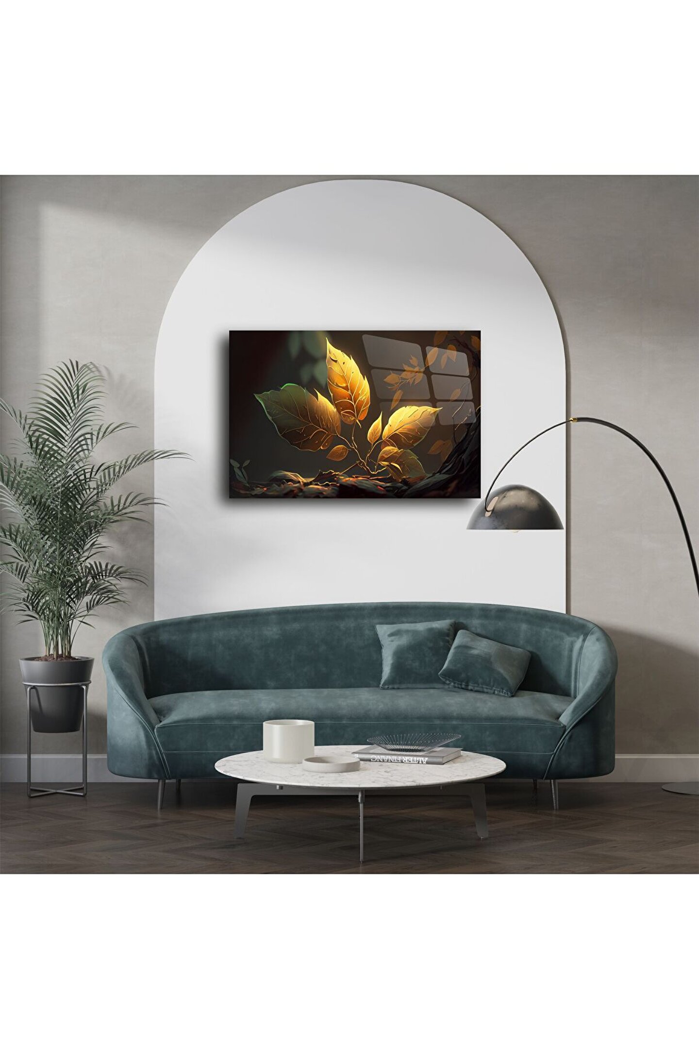 Zarif ve güçlü bir doğa simgesi olan altın yapraklar, ışıkla dans eden bu cam tablo üzerinde hayat buluyor. Gerçek cam panel üzerine yüksek çözünürlüklü olarak basılan bu yaprak sanatı, modern doğa temalı dekorun en estetik halini sunuyor.