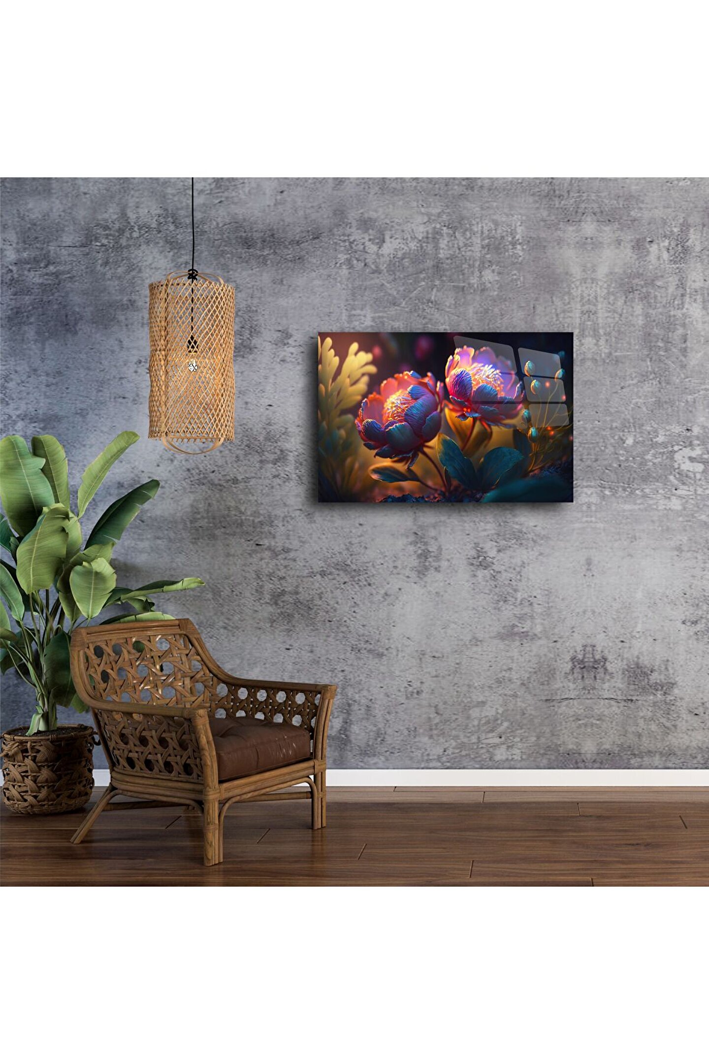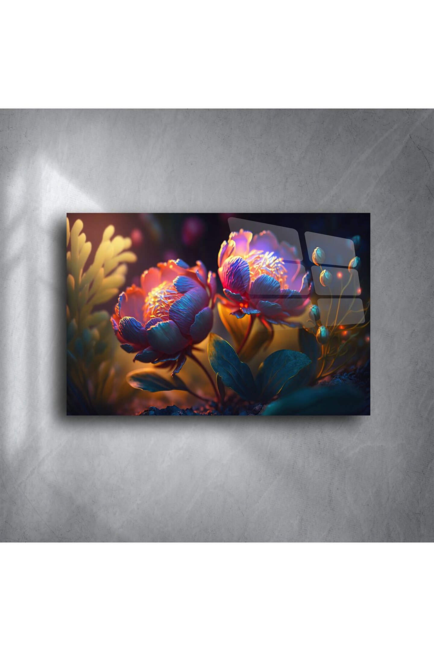 Canlı renkleriyle iç mekânlara hayat veren bu premium cam tablo, parlak yüzeyli çiçek tasarımıyla doğanın zarafetini duvarlarınıza taşıyor. Işıltılı botanik detayları ve derinlik hissi veren üç boyutlu dokusuyla lüks ve modern tarzı bir araya getiriyor.
