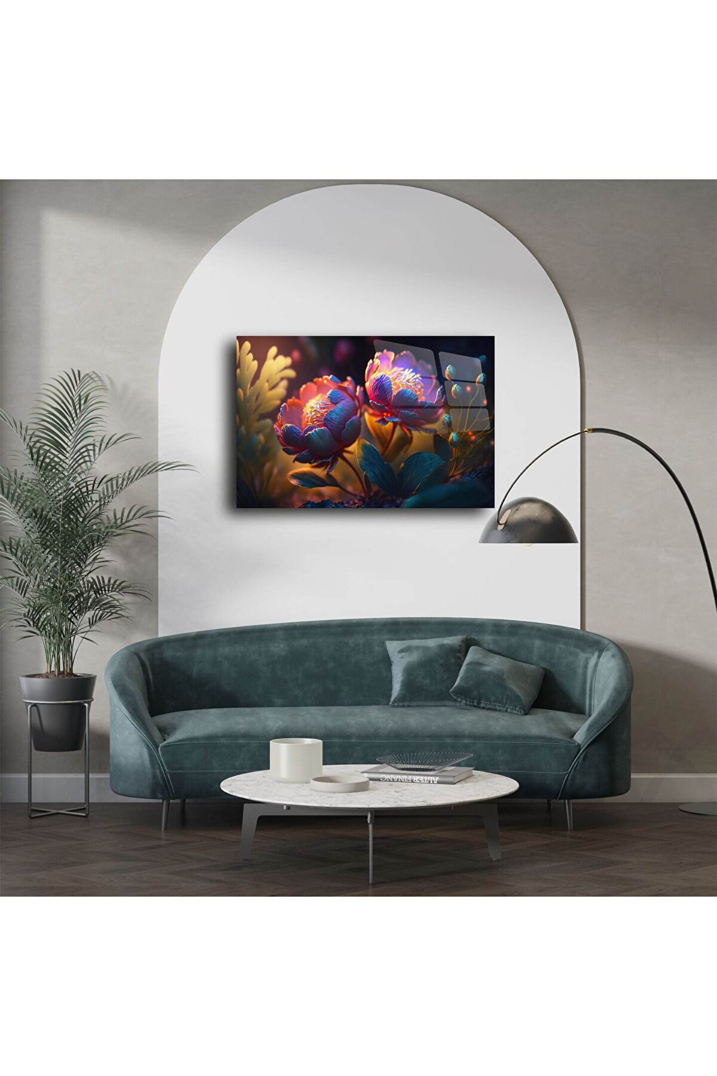 Canlı renkleriyle iç mekânlara hayat veren bu premium cam tablo, parlak yüzeyli çiçek tasarımıyla doğanın zarafetini duvarlarınıza taşıyor. Işıltılı botanik detayları ve derinlik hissi veren üç boyutlu dokusuyla lüks ve modern tarzı bir araya getiriyor.