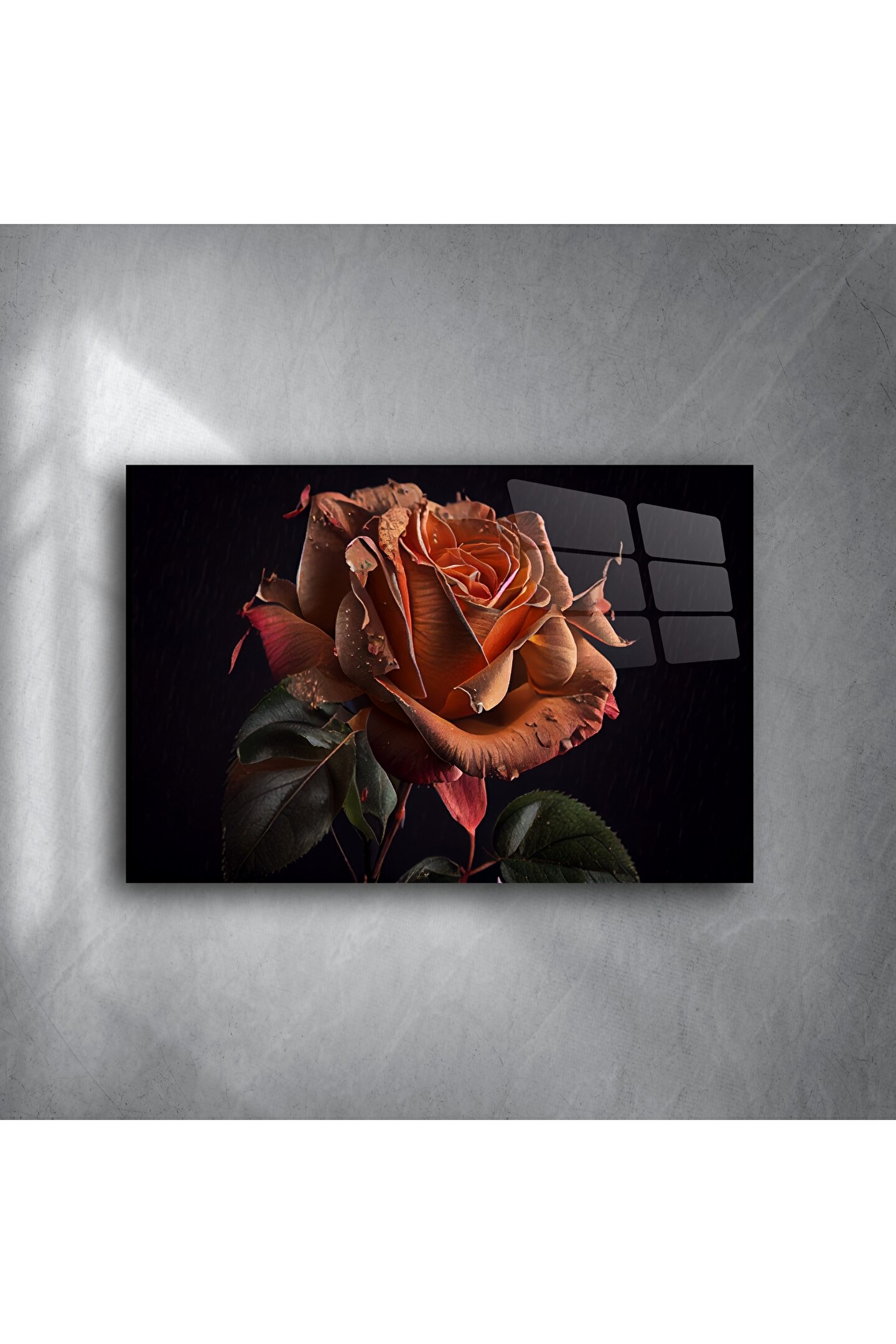 Bu çarpıcı fotoğraf baskısı, siyah arka plan önünde zarif bir gülü göstererek romantizm ve sofistike bir estetik yaratır. Gül yapraklarındaki çiy damlaları, duygusal derinlik ve doğal güzellik katarken, bu sanat eseri modern iç mekanlar için mükemmel bir odak noktasıdır.