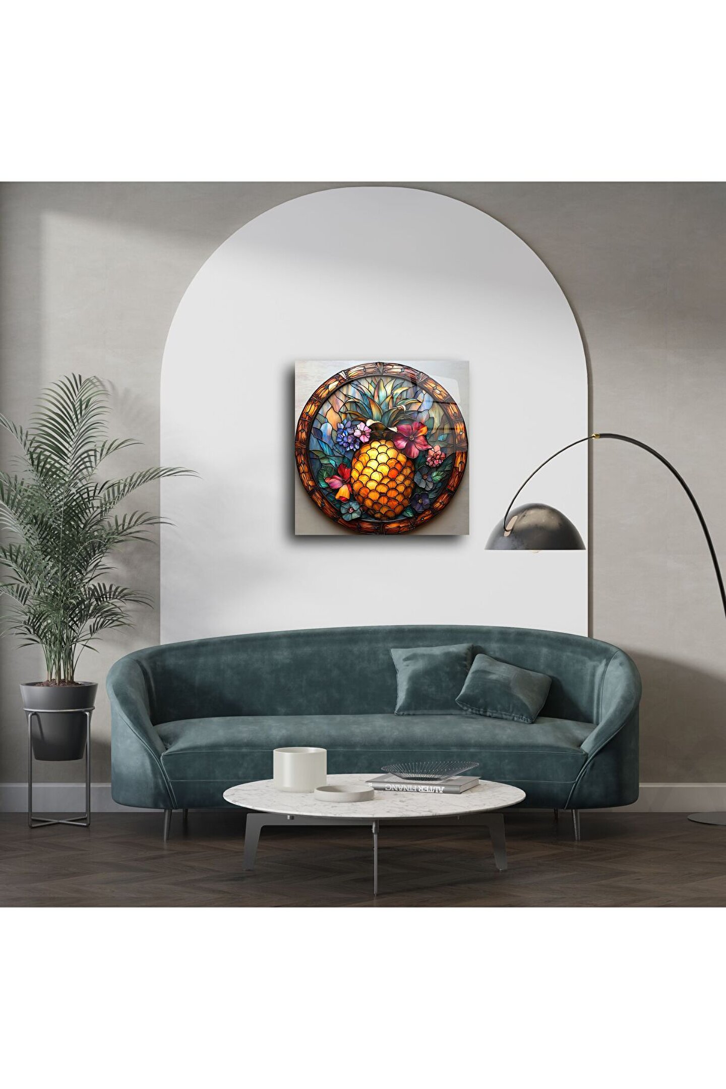 Canlı renkleri ve benzersiz vitray tarzıyla tasarlanmış bu Ananas Temalı Cam Tablo, mekanınıza tropikal bir neşe ve zarafet katıyor. El işçiliği detaylar ve çiçekli kompozisyon, yaşam alanlarınızı sanat galerisine çeviriyor.