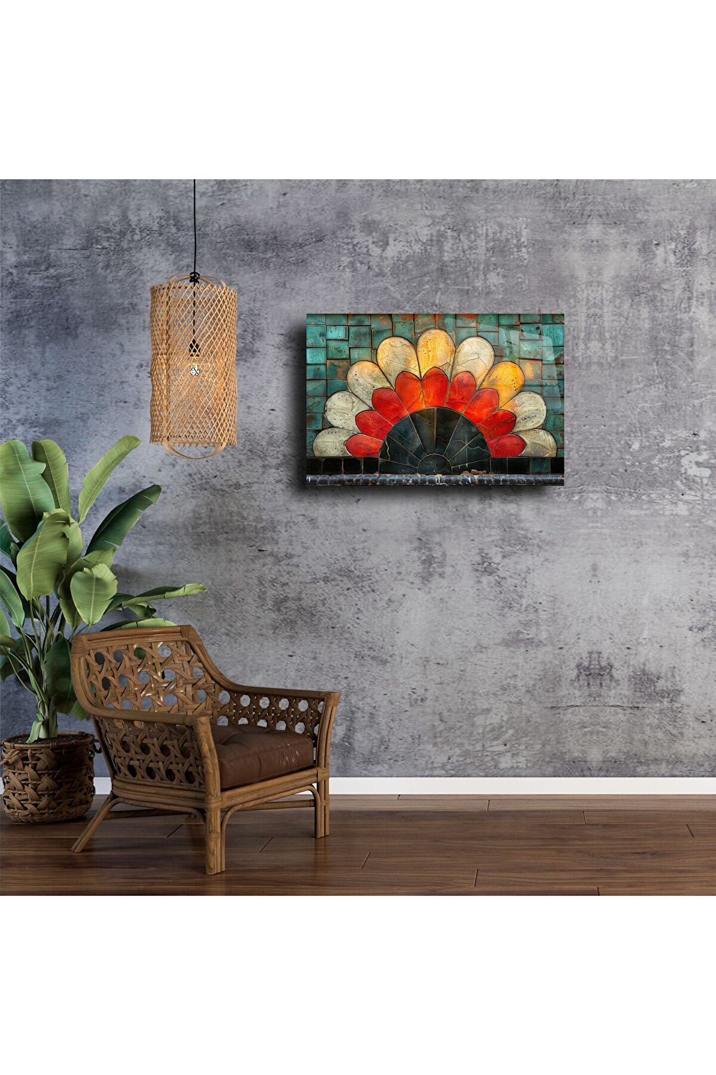 Bu renkli cam mozaik çiçek tablo, yaşam alanınıza neşe ve enerji katmak için ustalıkla elde üretildi. Işıltılı vitray camlarla hazırlanan bu eser; kırmızı, sarı, mavi ve yeşilin göz alıcı tonlarıyla çiçekleri adeta canlandırıyor. Her yaprak, her detay zarif bir işçiliğin parçası.