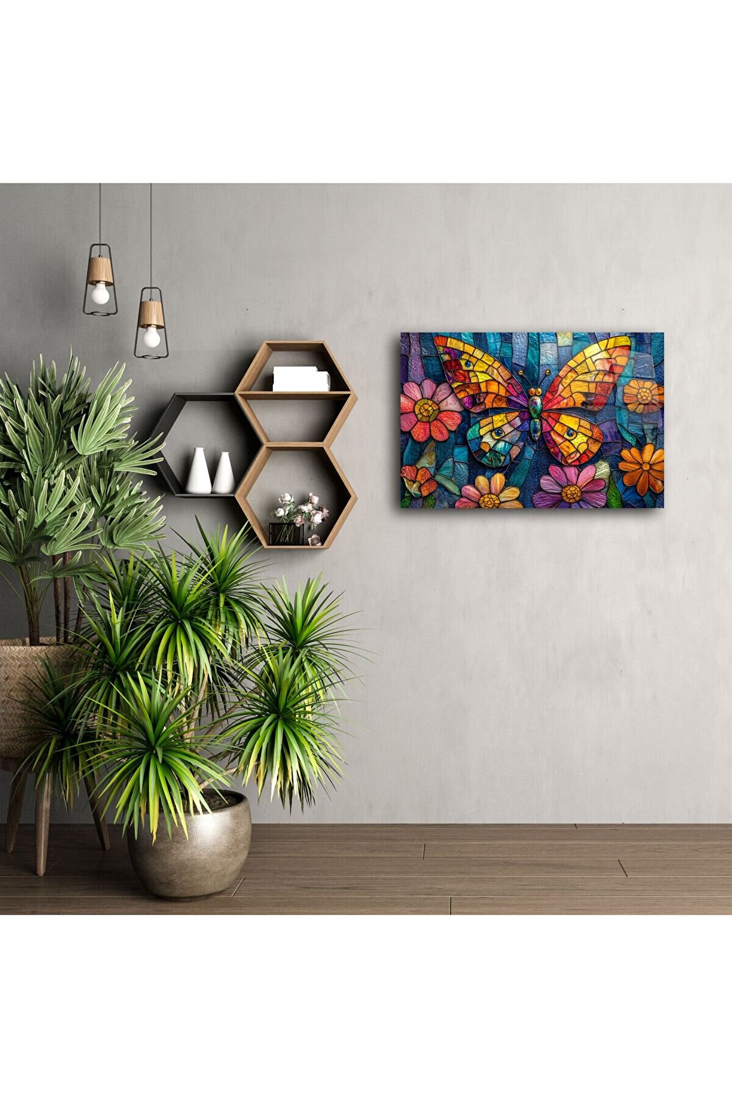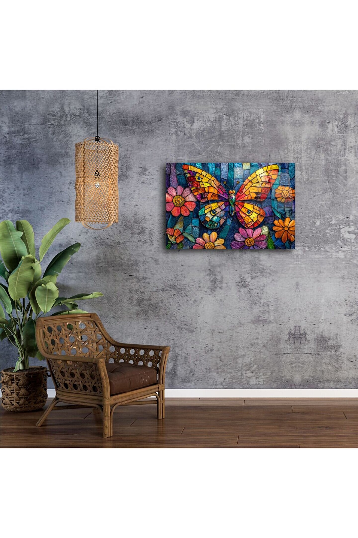 El yapımı cam mozaik kelebek duvar sanatı, doğal taşların ışıltısı ve canlı cam renklerinin buluşmasıyla öne çıkıyor. Bu tablo, kelebek ve çiçeklerin simgelediği yeniden doğuşu, umudu ve pozitif enerjiyi evinize taşıyor. Her parça, usta eller tarafından tek tek yerleştirilen cam mozaiklerden oluşur ve ışıkla büyüleyici bir dans yaratır.