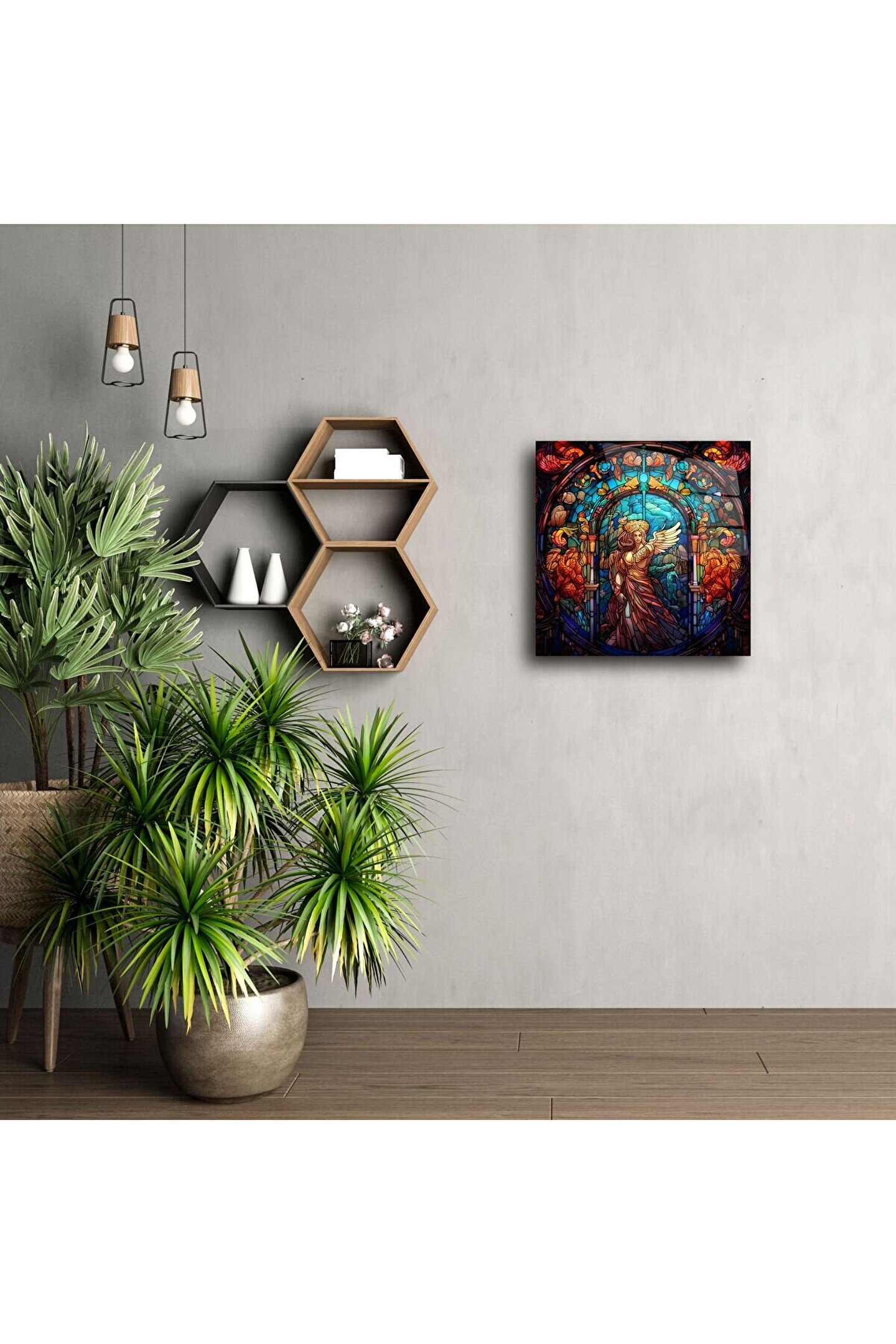 Bu büyüleyici renkli melek cam tablo, vitray sanatının zamansız zarafetini evinize taşıyor. Cam üzerindeki canlı tonlar ve ışıkla parlayan detaylar sayesinde, huzur, koruma ve şıklık hissini aynı anda yaşatır. El işçiliğiyle üretilmiş bu özel parça, iç mekânınıza kutsal bir dokunuş katarken, duvarlarınızı adeta bir sanat galerisinde gibi gösterir.