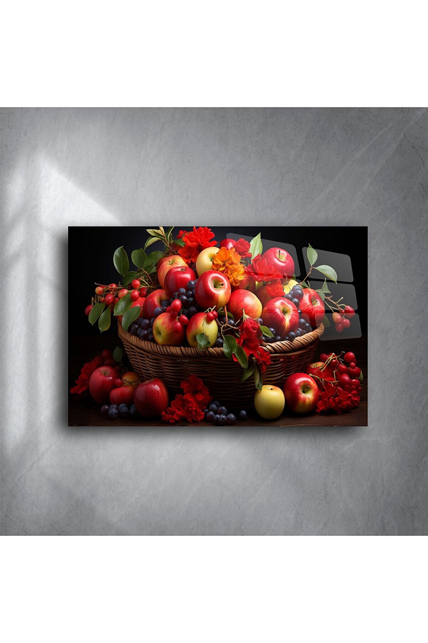 Doğanın canlı tonlarını evinize taşıyan bu şık cam tablo, taptaze meyvelerin zamansız güzelliğini göz alıcı bir kompozisyonda sunuyor. Kırmızı elmalar, üzümler ve çiçek dokunuşlarıyla dolu bu tablo, hem mutfağınıza sıcaklık katacak hem de yaşam alanlarınızı sanatla buluşturacak.