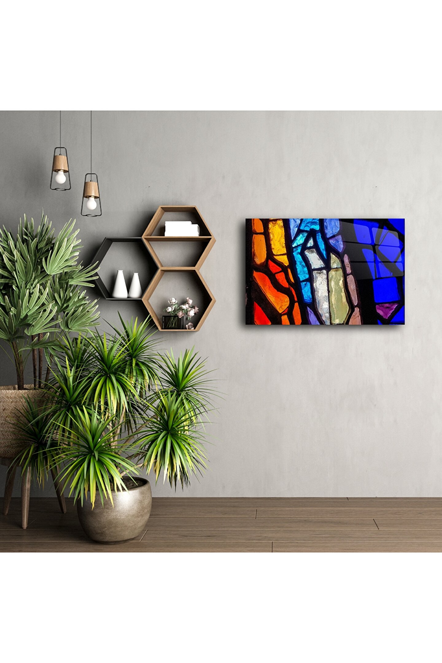 Renkli camın büyüleyici dokunuşuyla tasarlanmış bu soyut vitray tablo, ışığın oyunuyla hayat bulan bir sanat eseridir. El işçiliğiyle üretilen bu cam tablo, modern mekanlara sofistike bir ruh katar.