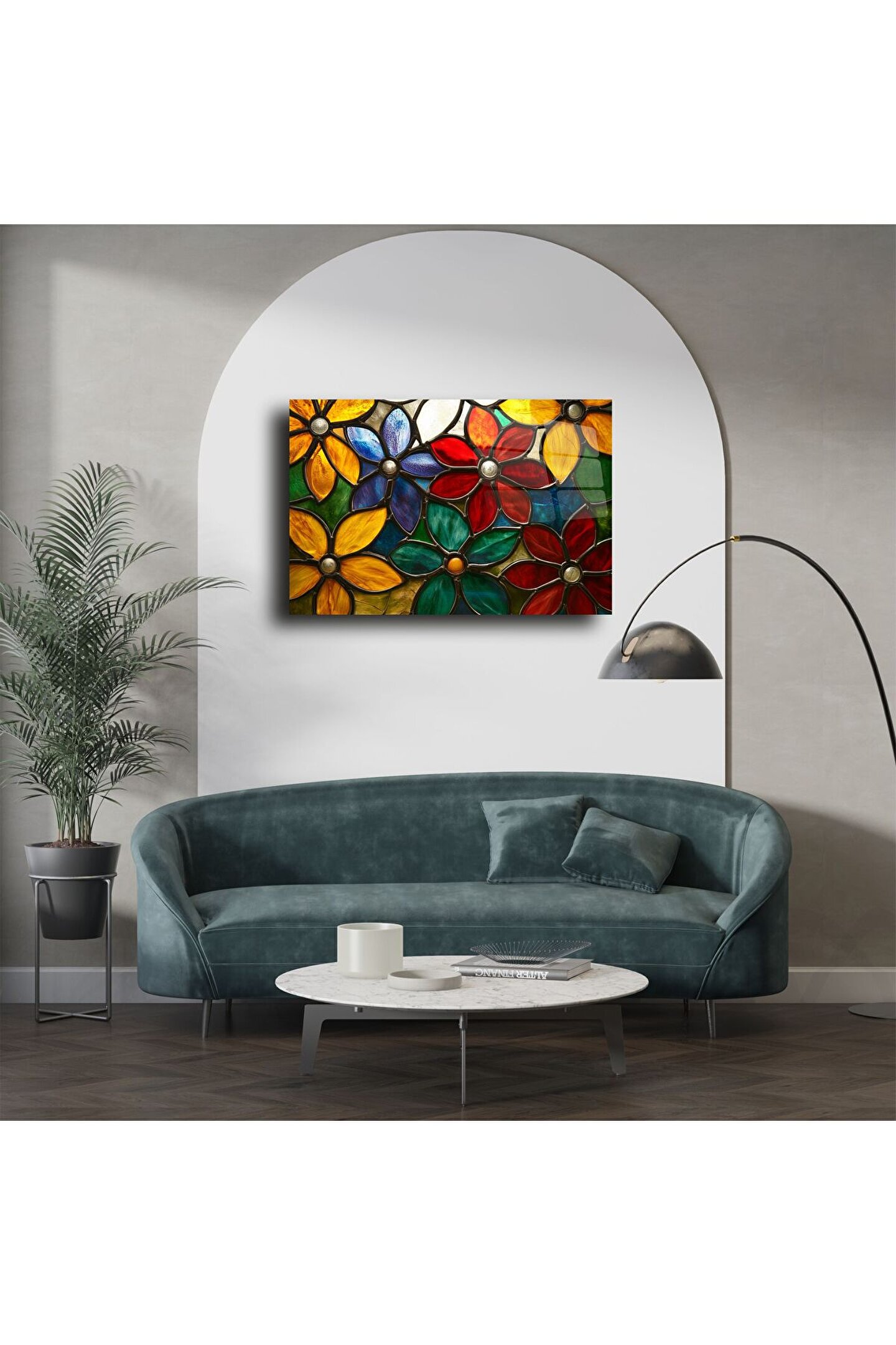 Renklerin büyüleyici ahengini cam zarafetiyle buluşturan bu vitray tarzı çiçek desenli cam tablo, her mekana hayat ve enerji katıyor. Sarı, kırmızı, mavi ve yeşilin cam mozaiklerle birleştiği bu tablo; hem ışığı yansıtır hem de göz alıcı bir odak noktası oluşturur.