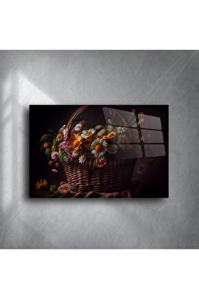 LEYLASER Rustik Hasır Sepette Papatya ve Bahar Çiçekleri Kanvas Cam Tablo