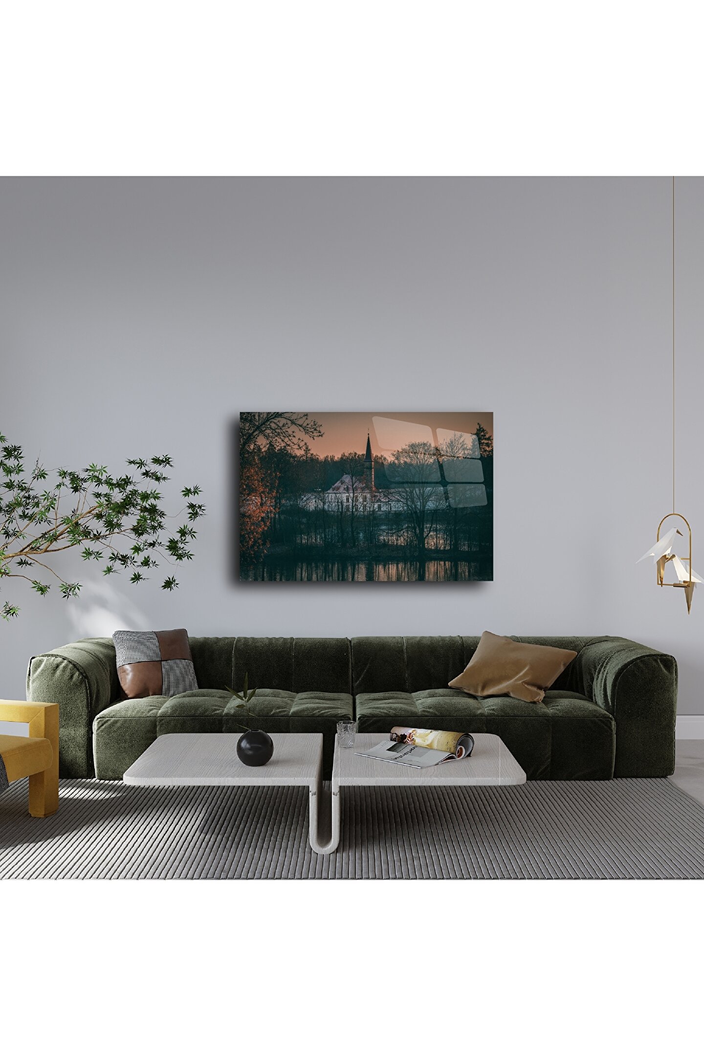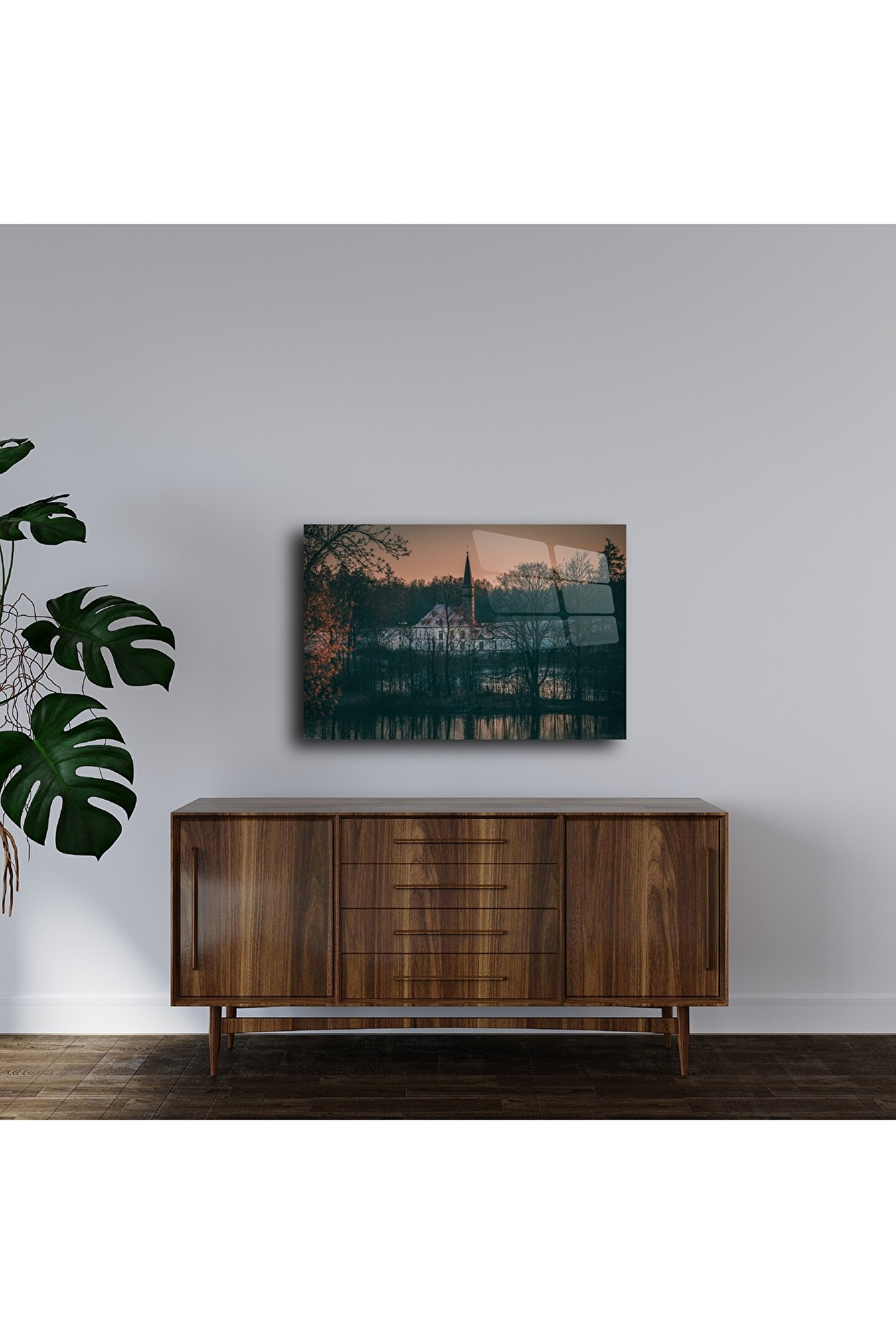 Bu rustik cam tablo, ormanla çevrili tarihi bir kiliseyi gün batımının yumuşak ışıklarıyla buluşturuyor. Doğanın içinde saklanmış bir mabedi andıran kompozisyon, yaşam alanınıza dinginlik ve sanatsal bir dokunuş kazandırır.