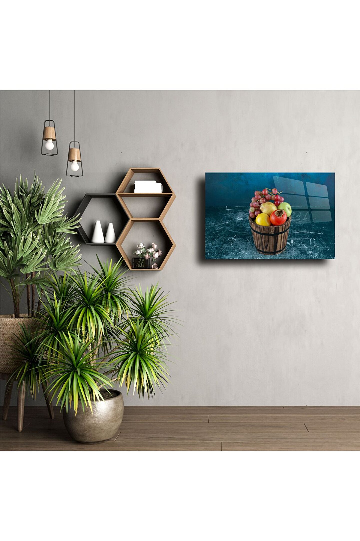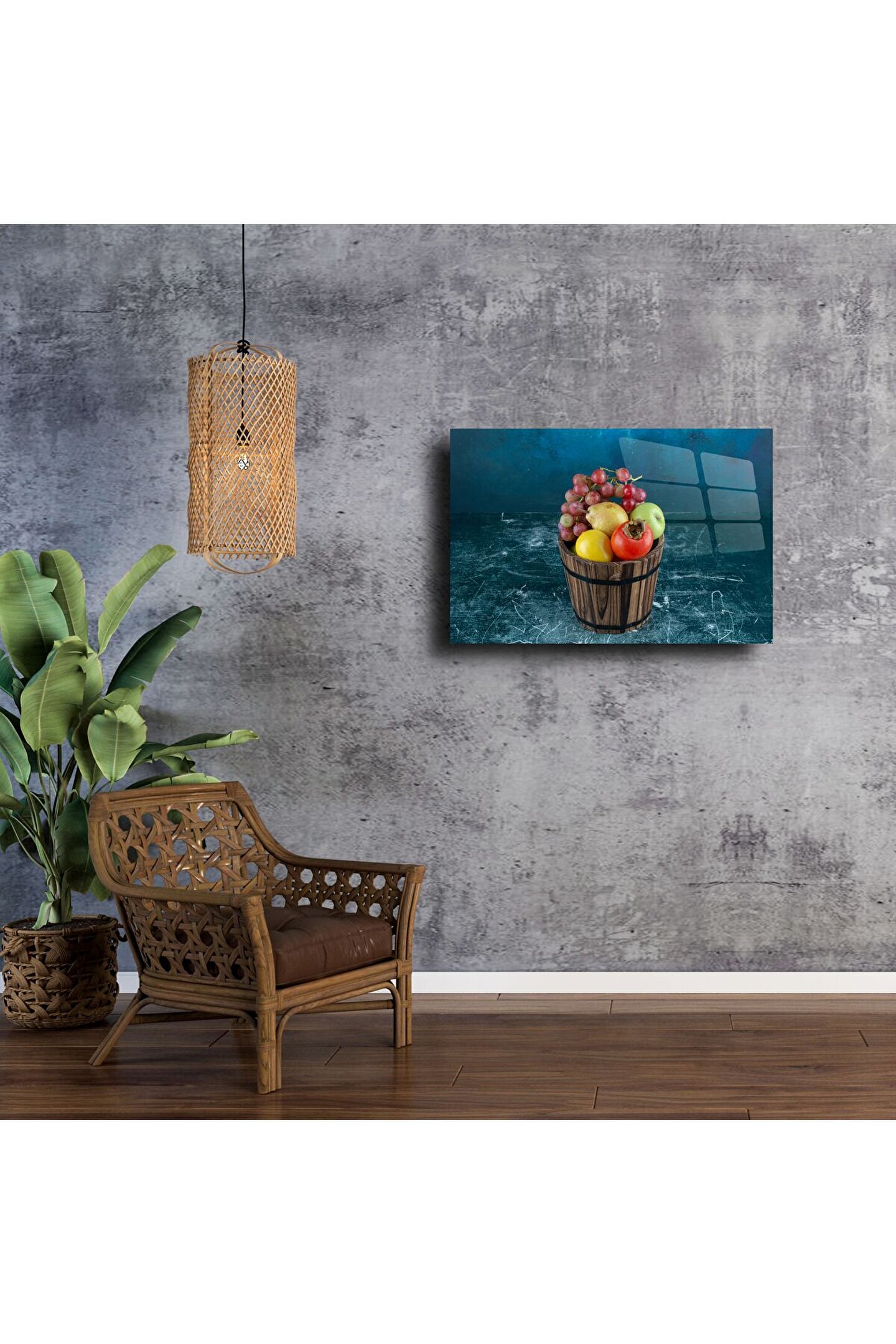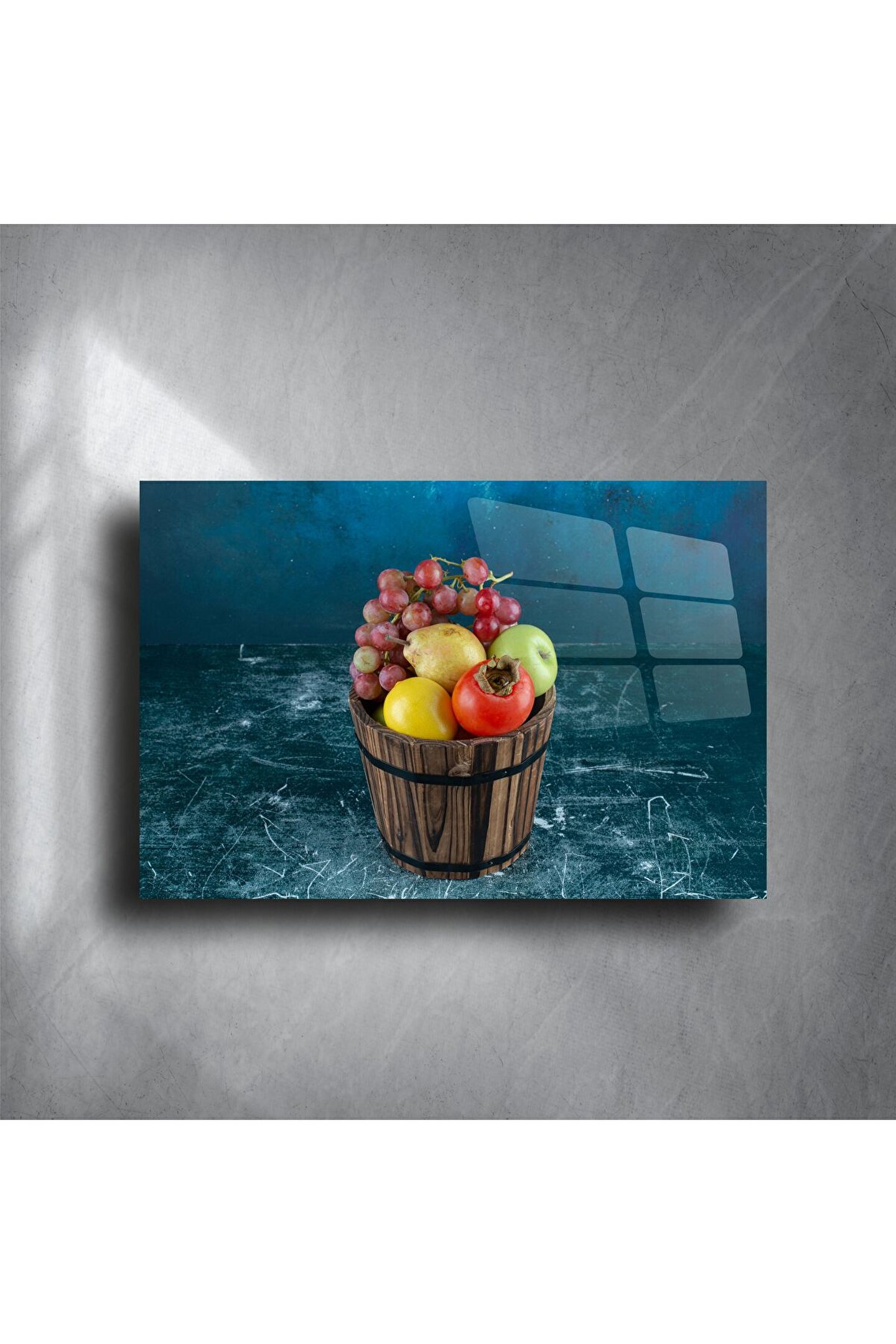 Doğal ve nostaljik atmosferin modern sanatla buluştuğu bu rustik meyve kovası temalı cam tablo, evinizin duvarlarında sıcak bir hikâye anlatır. Ahşap fıçı içindeki elma, nar, üzüm ve limon detaylarıyla zenginleşen bu tasarım, mavi ve dokulu fonuyla etkileyici bir derinlik sunar. Temperli cam yüzey, canlı renkler ve net detaylarla göz alıcı bir görünüm sağlar.