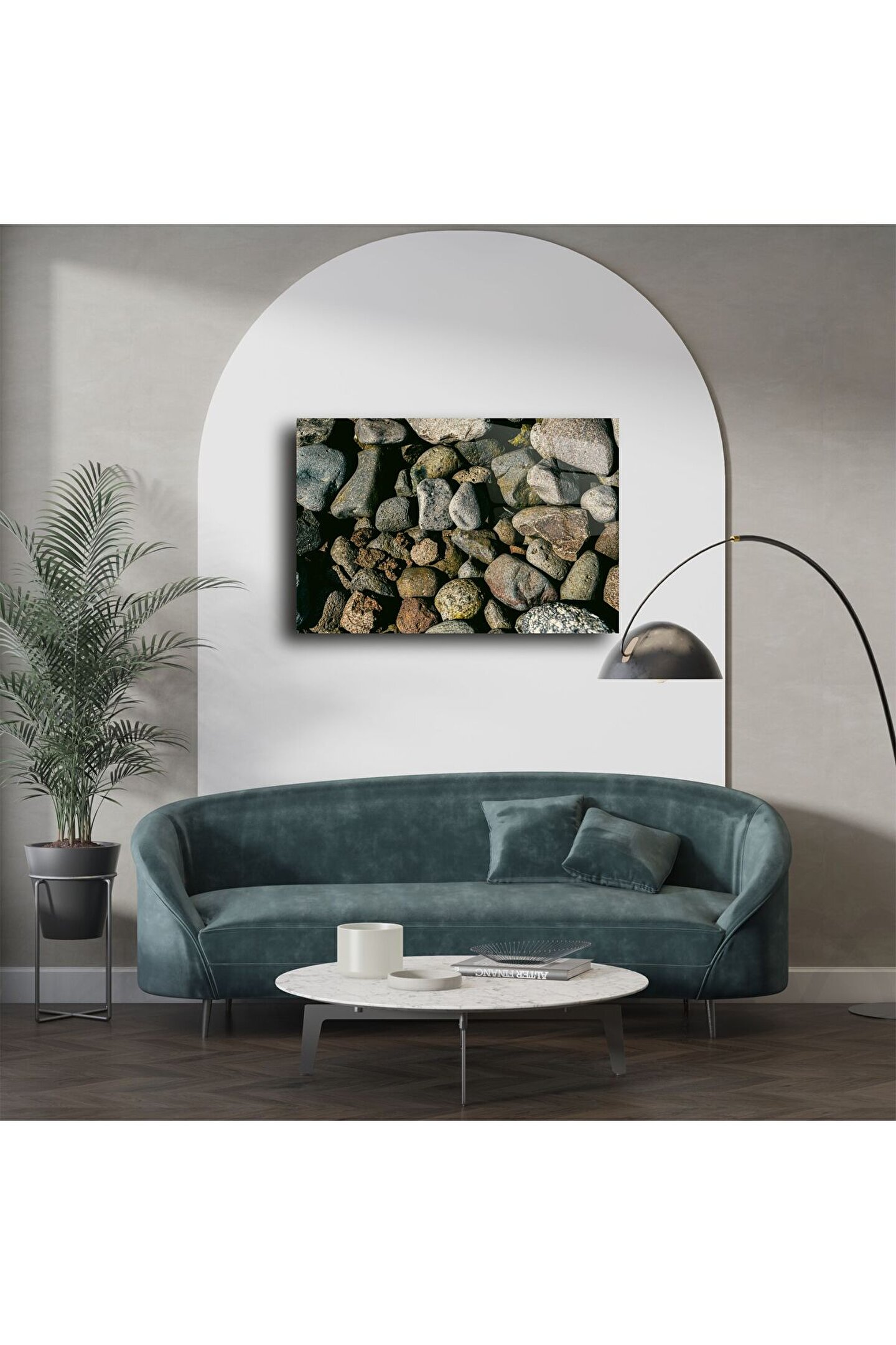 Doğal taşların sakinleştirici enerjisini yansıtan bu rustik nehir taşı duvar sanatı, evinize huzur ve topraklanmışlık hissi getirir. Yüksek çözünürlüklü baskı, taşların dokusal zenginliğini ve toprak tonlarının estetik zarafetini gerçekçi bir şekilde yansıtır.