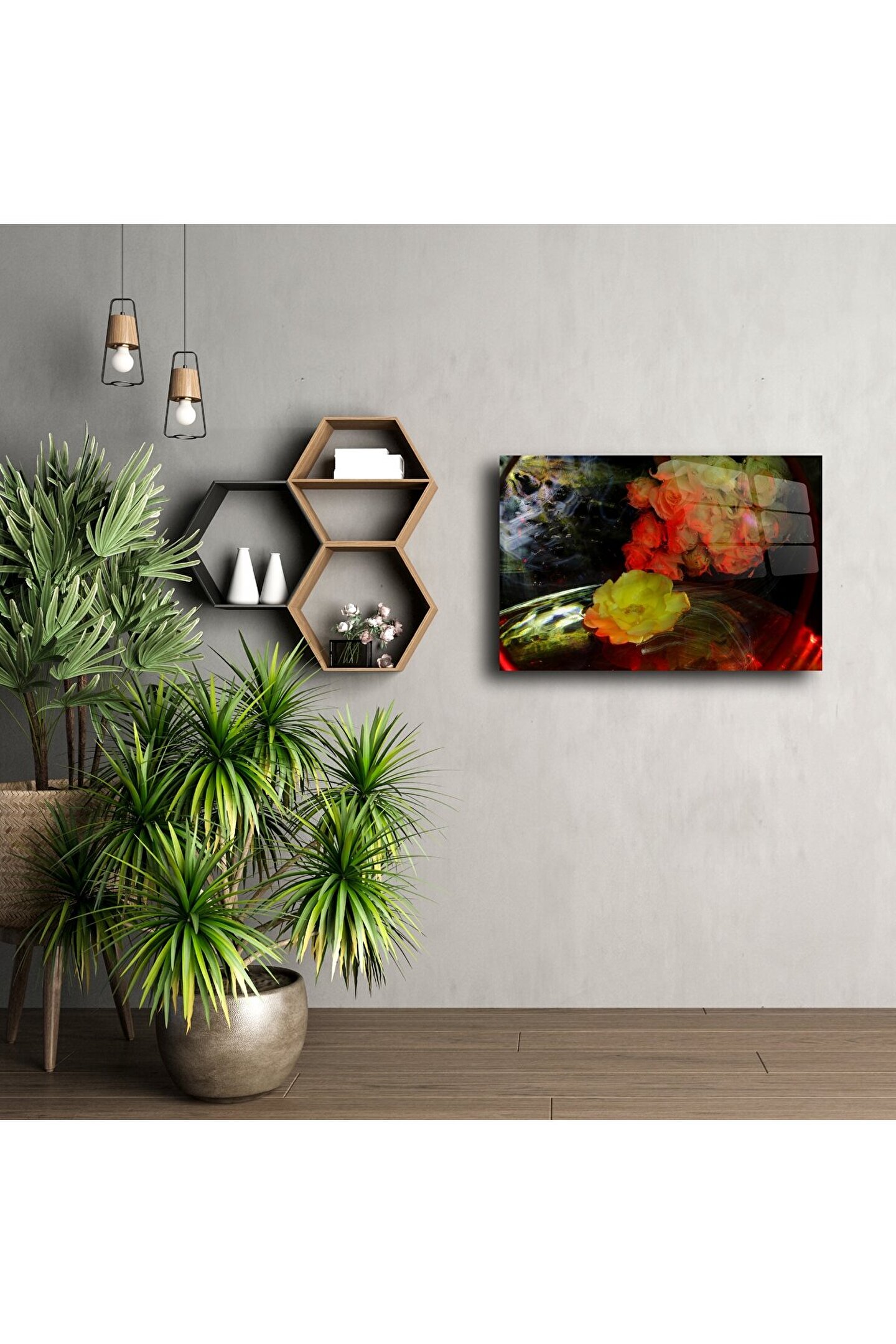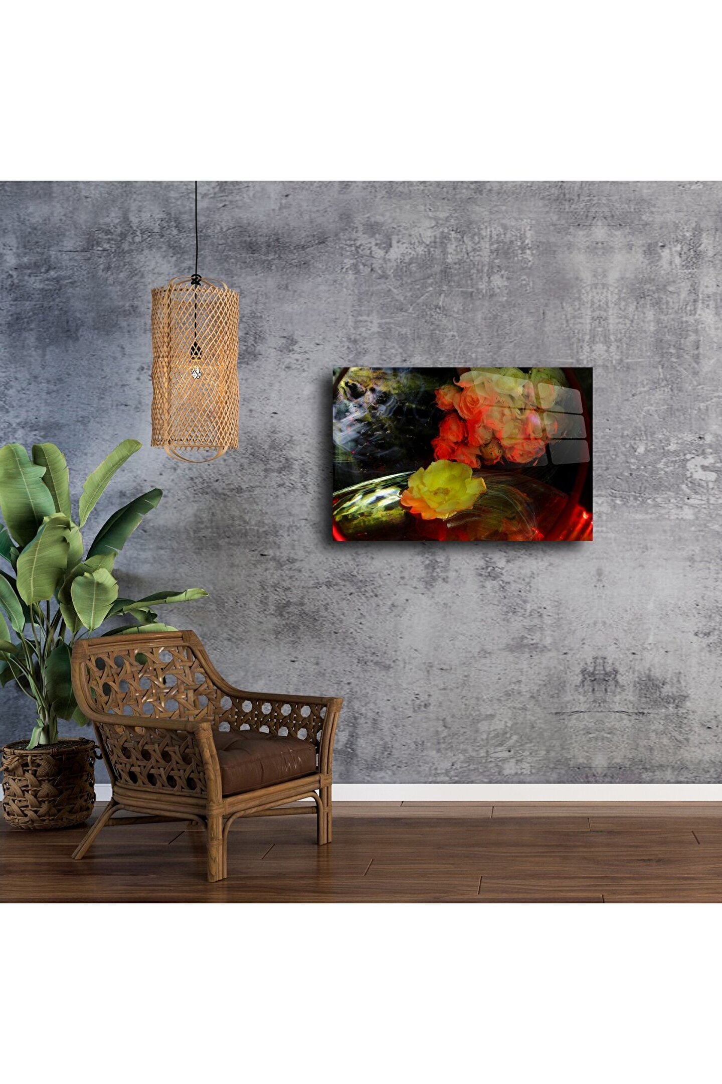 Bu etkileyici cam tablo, sarı ve kırmızı güllerin soyut ve derinlikli yansımalarıyla romantizmi modern sanatla buluşturuyor. Parlak cam yüzeyin sunduğu yüksek netlik ve renk canlılığı, çiçeklerin zarafetini duvara taşıyor.