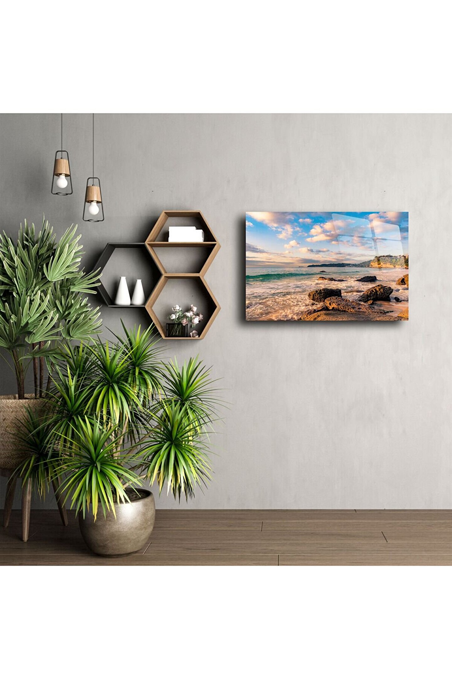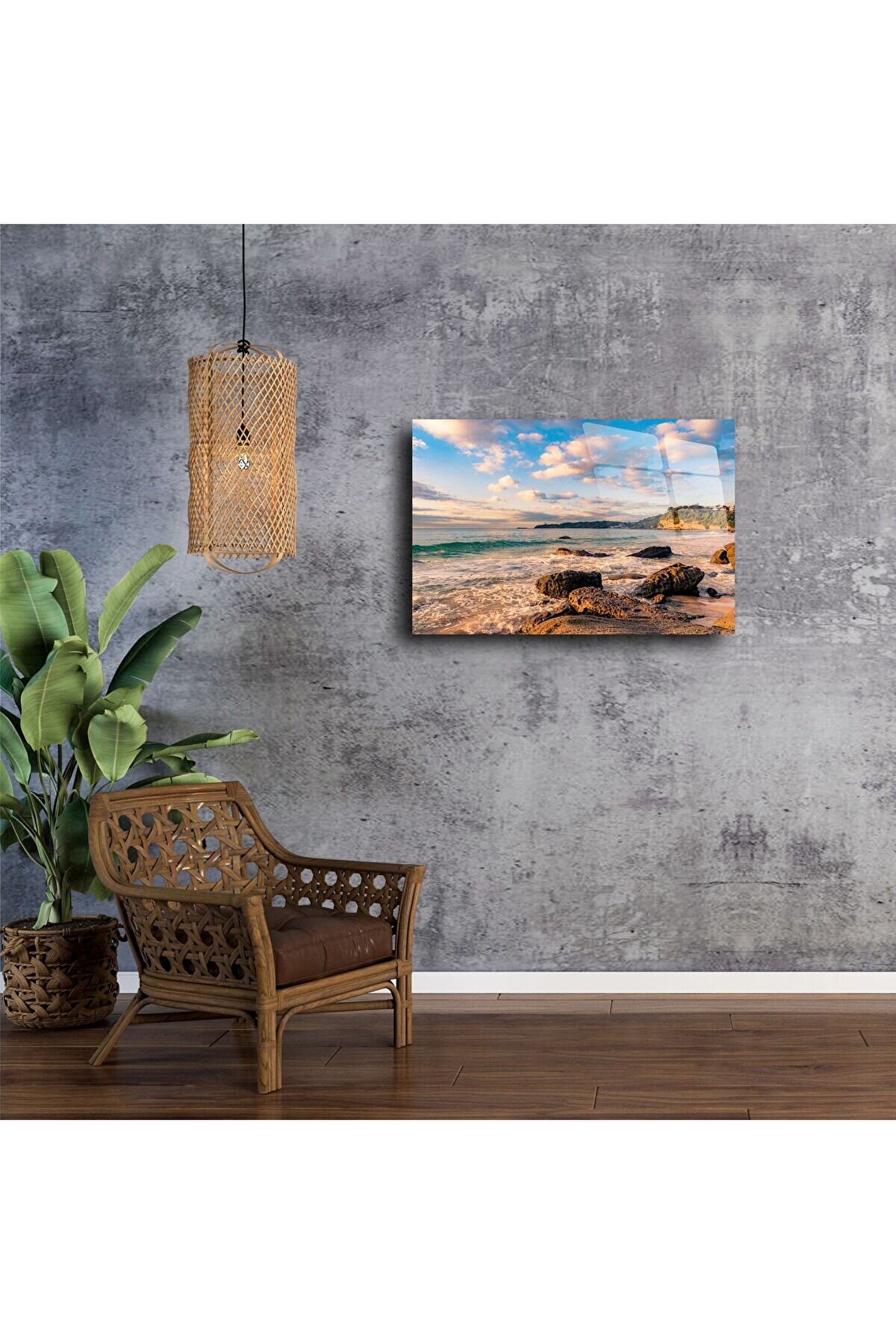 Serin renk tonlarıyla bezeli bu huzur verici deniz manzaralı cam tablo, evinize dinginlik ve zarafet katıyor. Cam yüzey üzerine yüksek çözünürlükle basılan plaj kompozisyonu, gün batımının yumuşak ışıkları ve suyun sakin dalga dokusuyla birleşiyor. Minimalist dekor stillerine uyumlu olan bu sanat eseri, modern iç mekanlara doğal bir nefes katar.