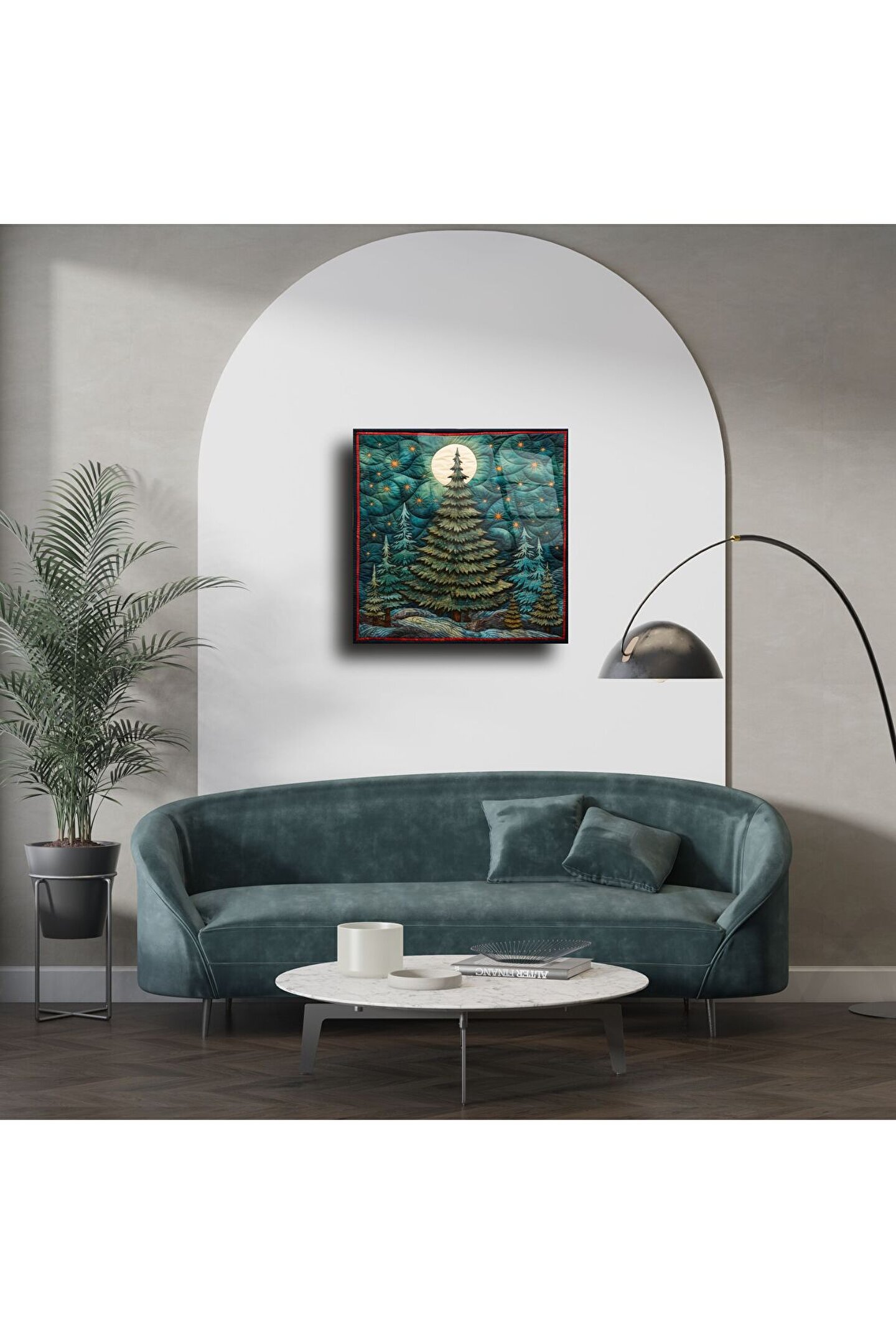 Bu el yapımı vitray tarzı orman desenli yorgan duvar örtüsüyle evinize ormanın sıcaklığını taşıyın. Ay ışığı altında silüeti belirginleşen huzurlu bir çam ağacıyla bezenmiş bu parça, nostalji, huzur ve doğa büyüsünü yansıtır.