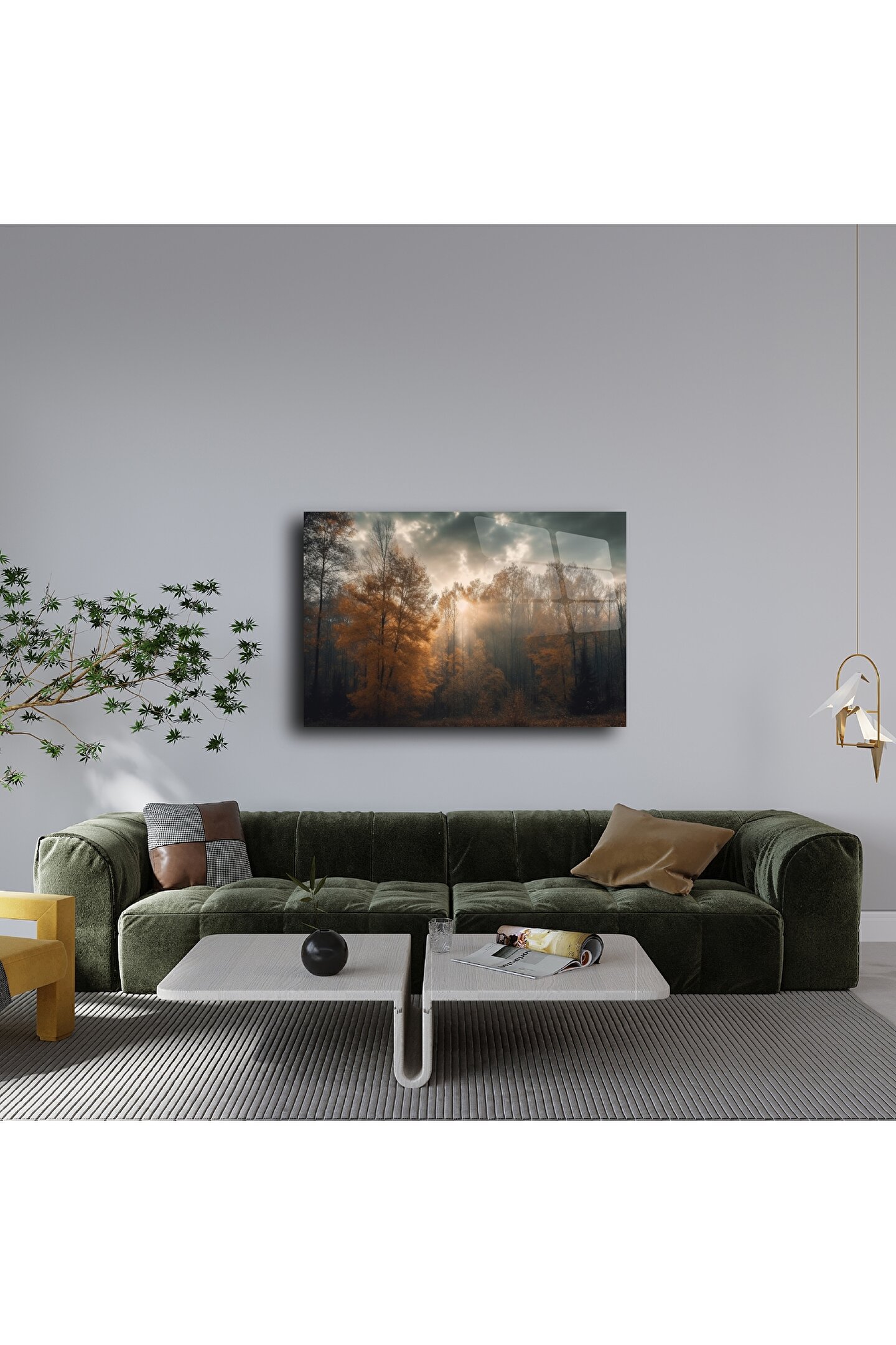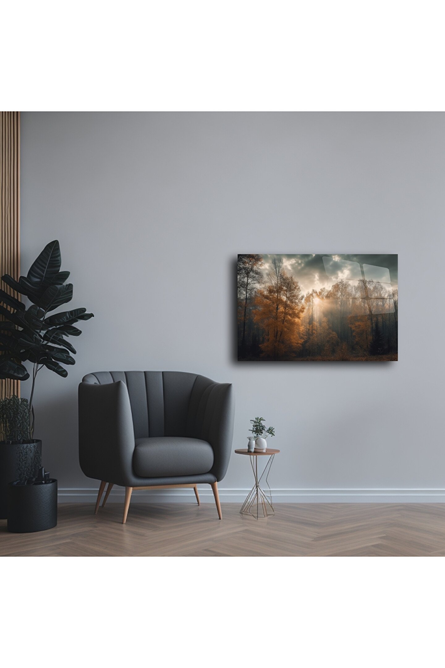Bu cam duvar tablosu, bulutların arasından süzülen güneş ışığıyla aydınlanan sisli bir ormanda geçen büyülü bir anı ölümsüzleştiriyor. Sonbaharın sıcak tonları, doğanın ruhunu yansıtan zarif bir atmosfer yaratırken, cam yüzey ışığı muhteşem şekilde yansıtarak görüntüyü canlı ve derin hale getiriyor.
