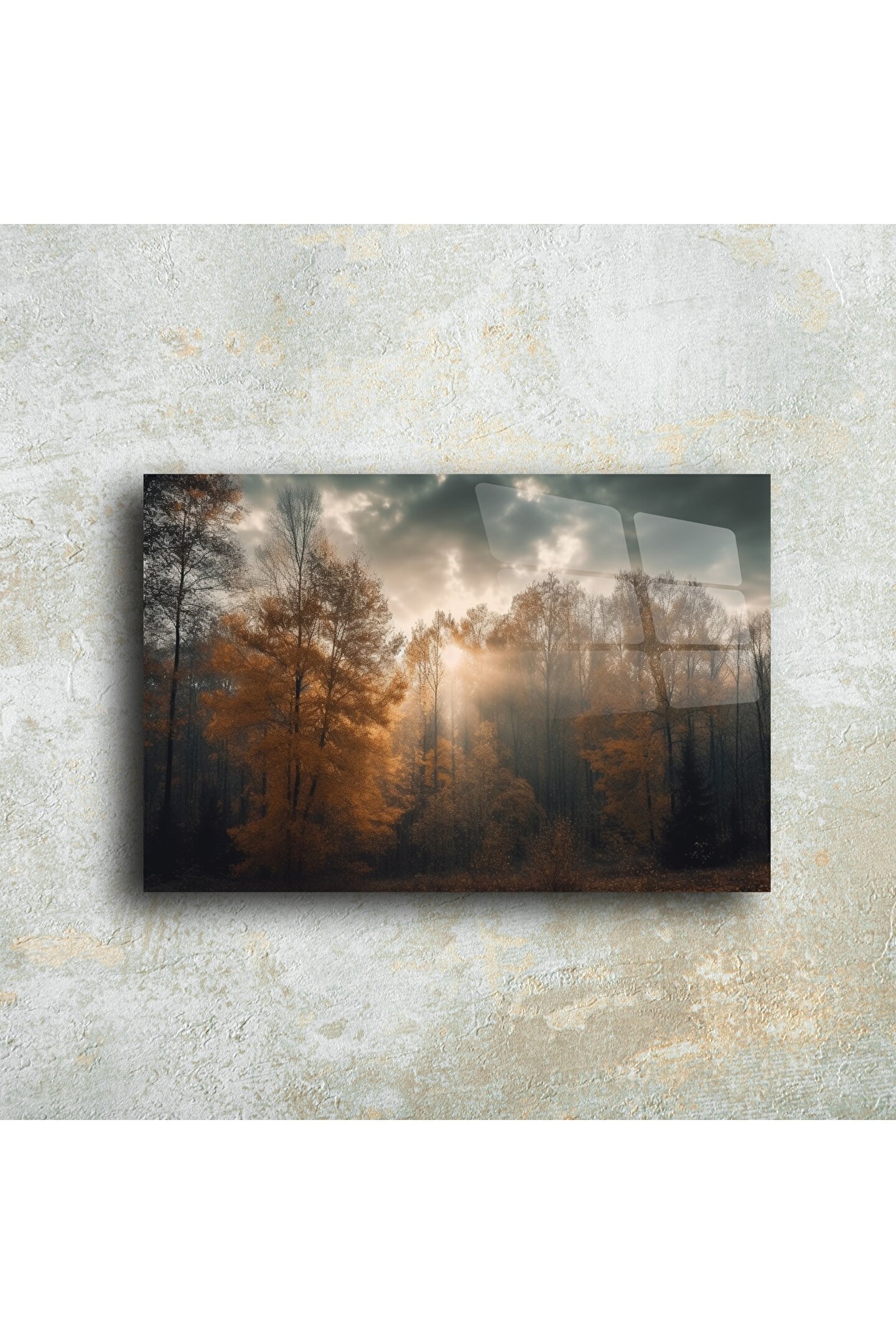 Bu cam duvar tablosu, bulutların arasından süzülen güneş ışığıyla aydınlanan sisli bir ormanda geçen büyülü bir anı ölümsüzleştiriyor. Sonbaharın sıcak tonları, doğanın ruhunu yansıtan zarif bir atmosfer yaratırken, cam yüzey ışığı muhteşem şekilde yansıtarak görüntüyü canlı ve derin hale getiriyor.