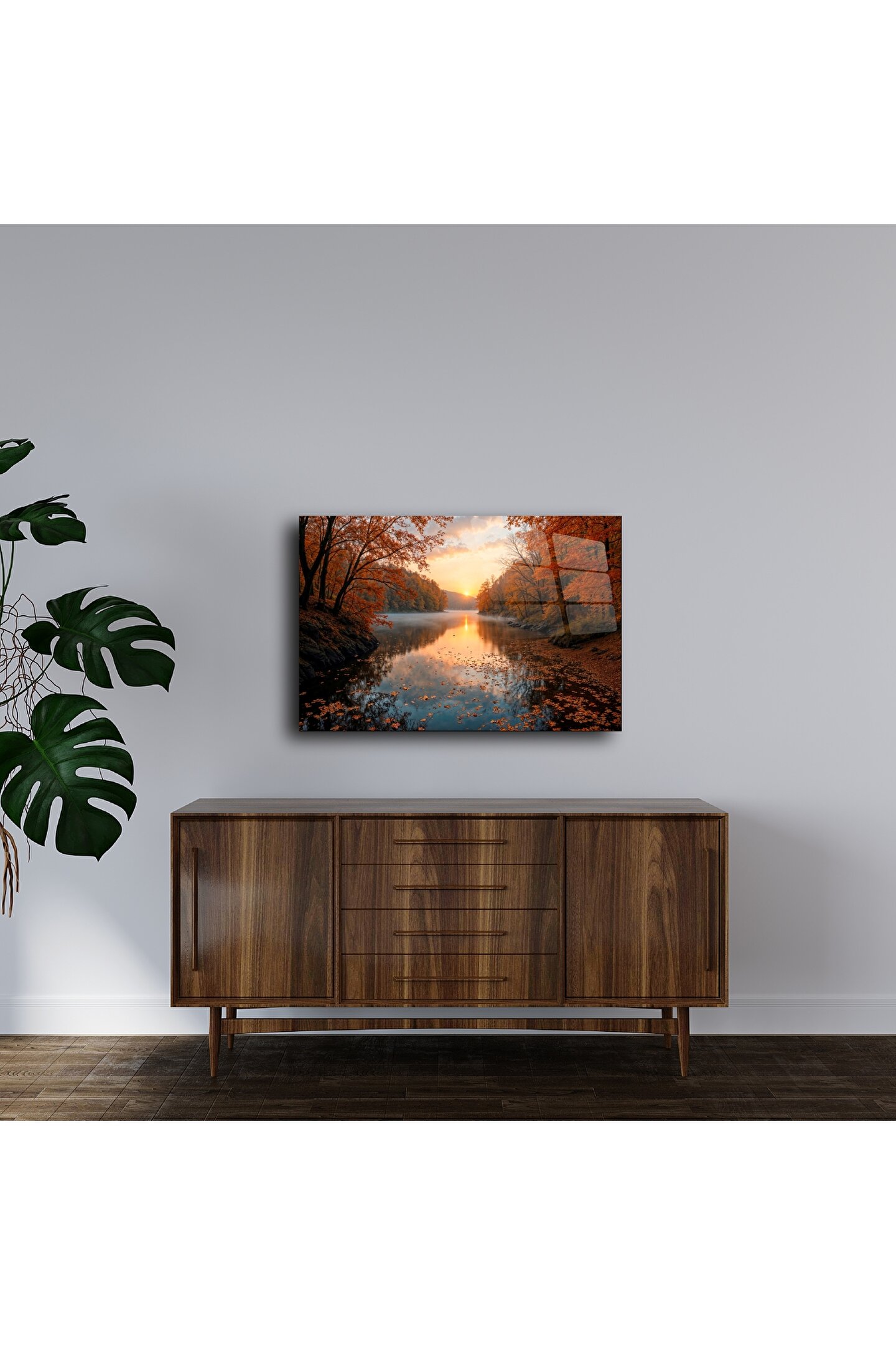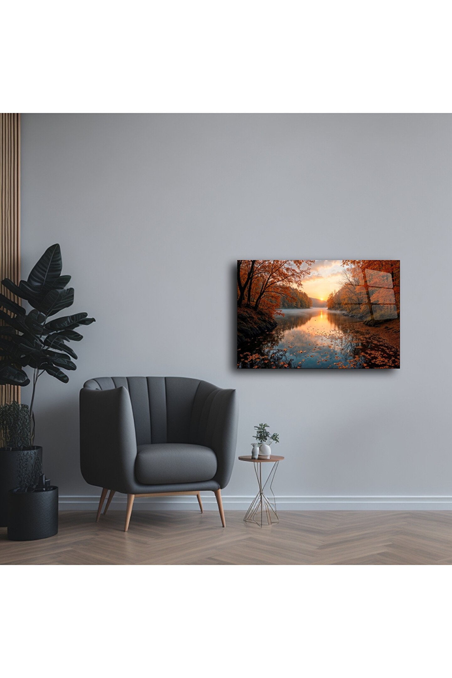 Bu büyüleyici cam tablo, sonbaharın sıcak tonlarını ve doğanın dinginliğini evinize taşıyor. Altın rengi yaprakların süslediği orman, göle yansıyan gün batımıyla birleşerek adeta huzurun cam üzerindeki yansıması oluyor.