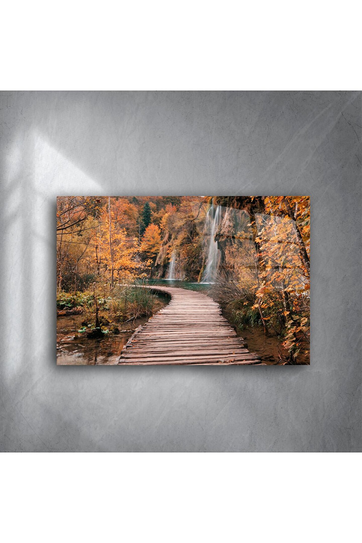 Sonbaharın büyüleyici renkleri, ahşap bir patika ve serinletici bir şelale... Bu özel cam tablo, doğayla iç içe olma hissini duvarlarınıza taşıyor. Renklerin geçişi, suyun hareketi ve ahşap dokunun huzuruyla birleşen bu sahne, modern yaşam alanlarında doğal bir nefes gibi yerini alır.