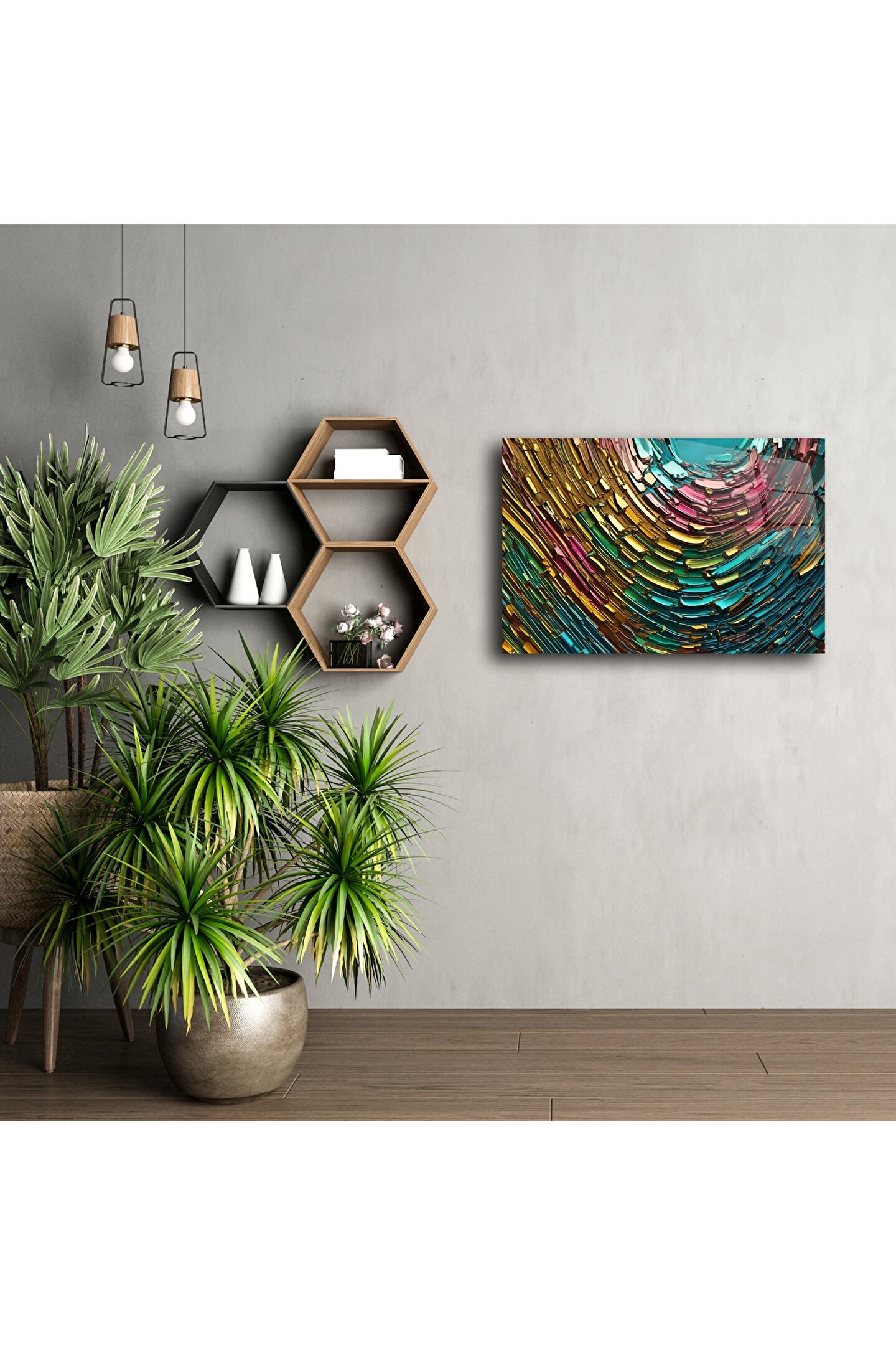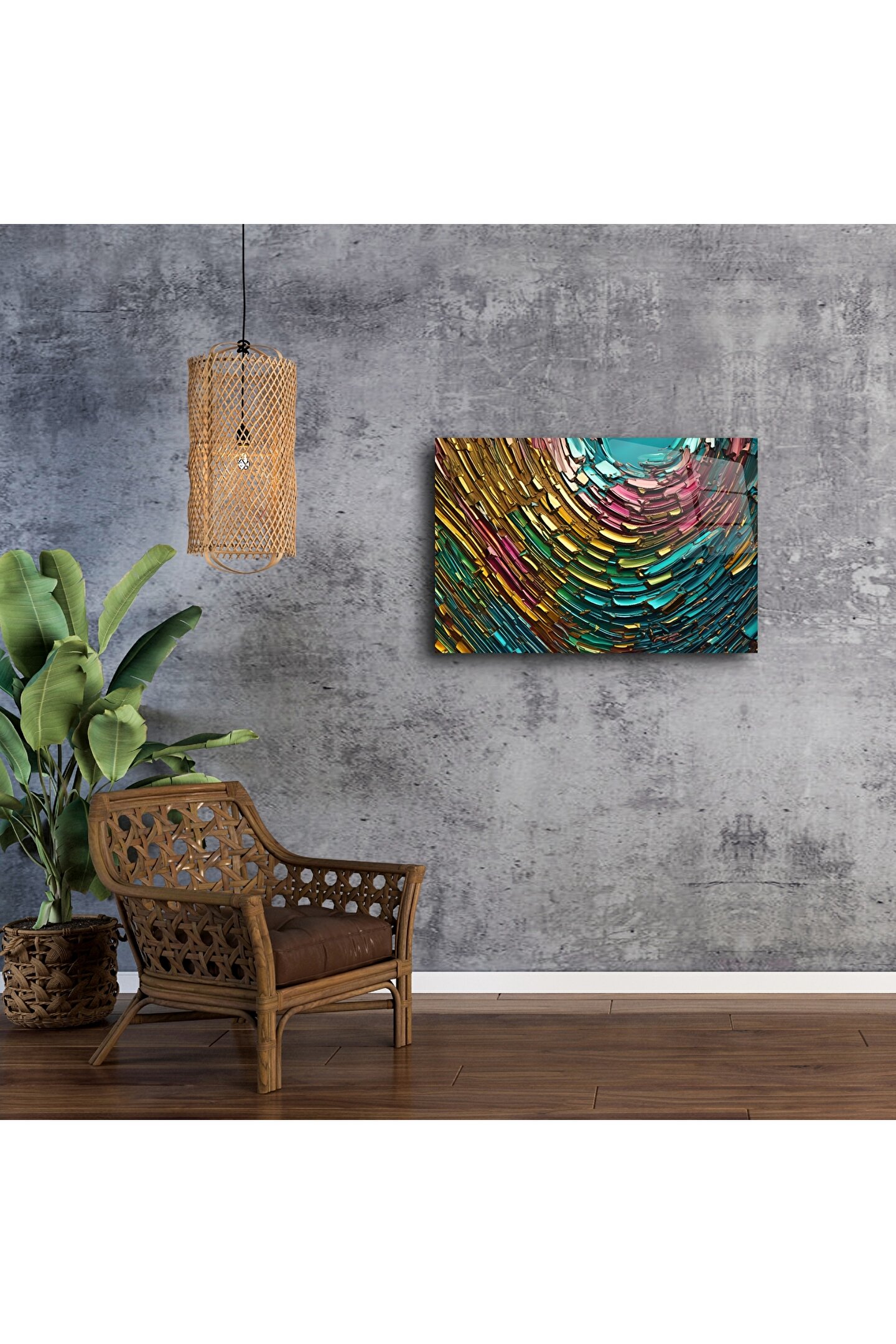 Parlak cam yüzey üzerinde renklerin dansı… Turkuaz, altın, pembe ve zümrüt tonlarının spiral formda birleştiği bu cam tablo; dinamizm, enerji ve modernliği yaşam alanlarınıza taşıyor. Soyut formu ve güçlü renk geçişleriyle göz alıcı bir vurgu parçası sunar.