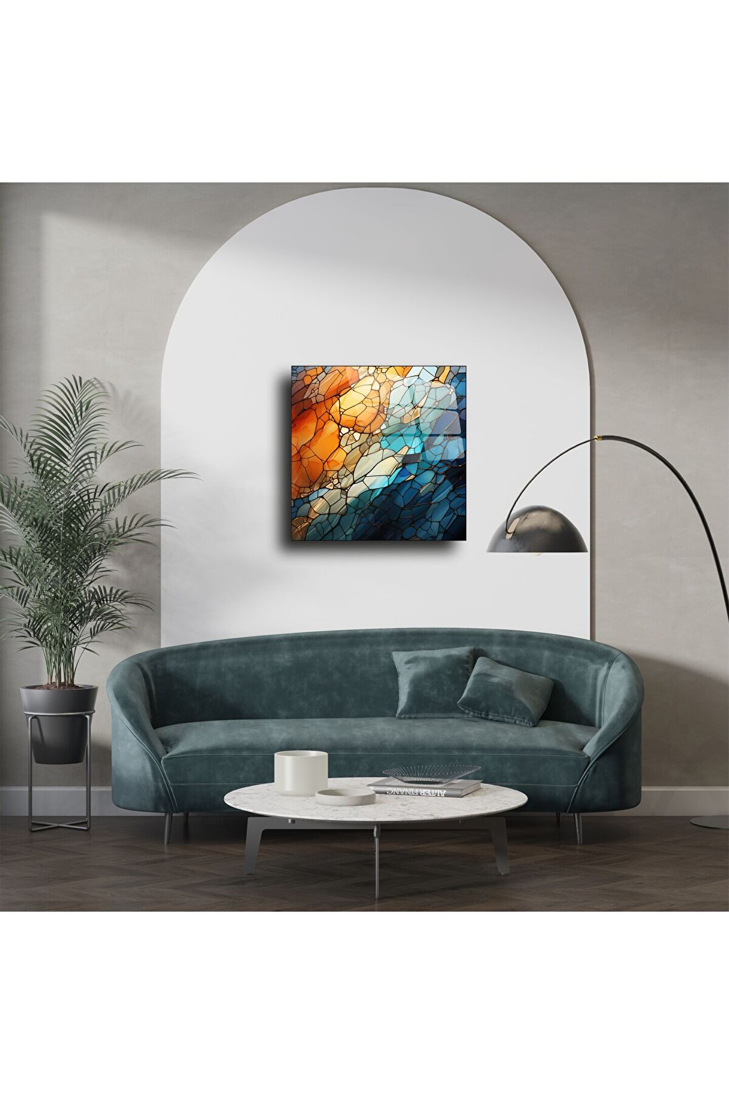 Modern sanatı yaşam alanınıza taşıyan bu soyut cam tablo, dinamik turuncu ve mavi tonların armonisiyle tasarlanmıştır. Renk geçişleriyle derinlik hissi yaratan bu cam panel, minimalist çizgilerle çağdaş bir atmosfer sunar.