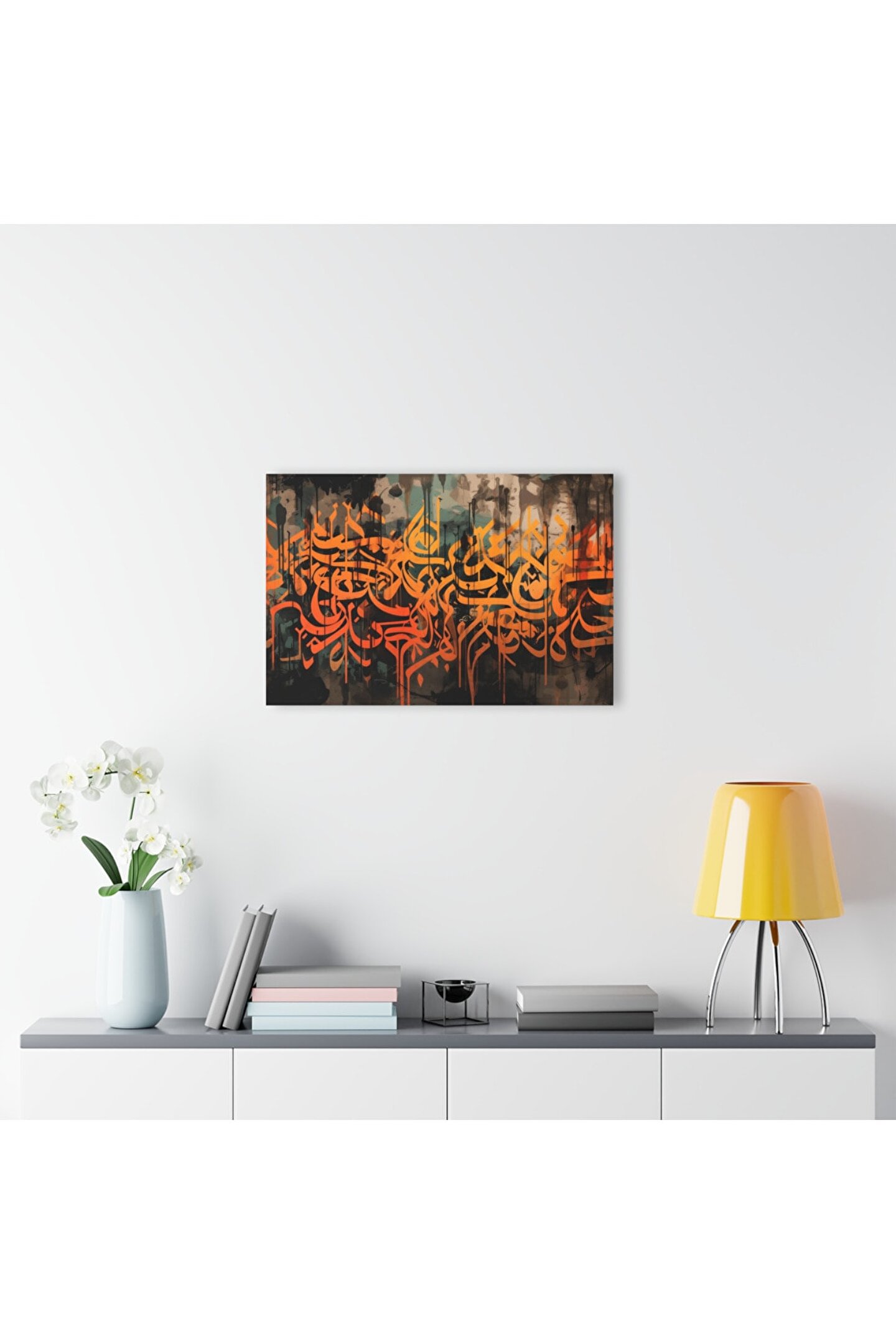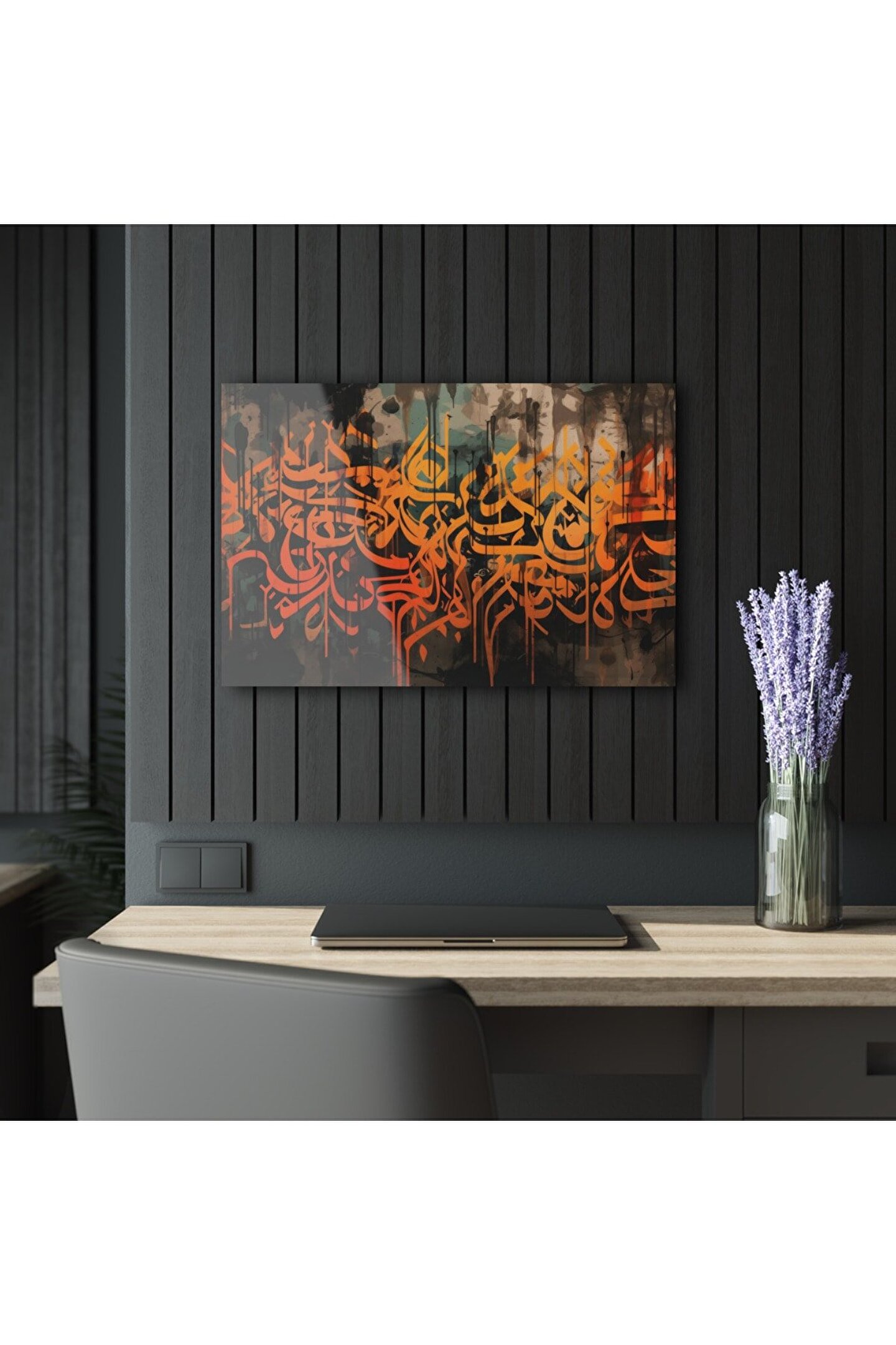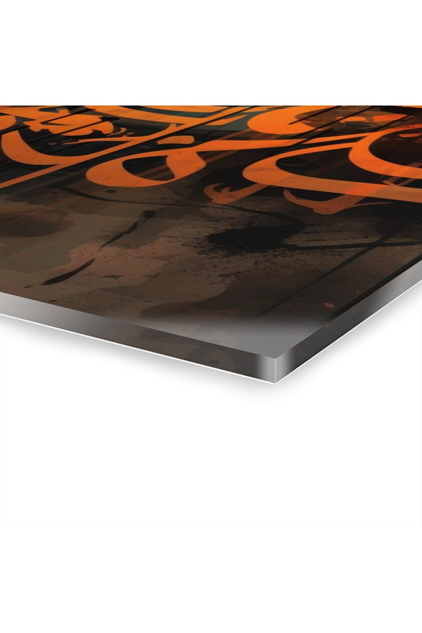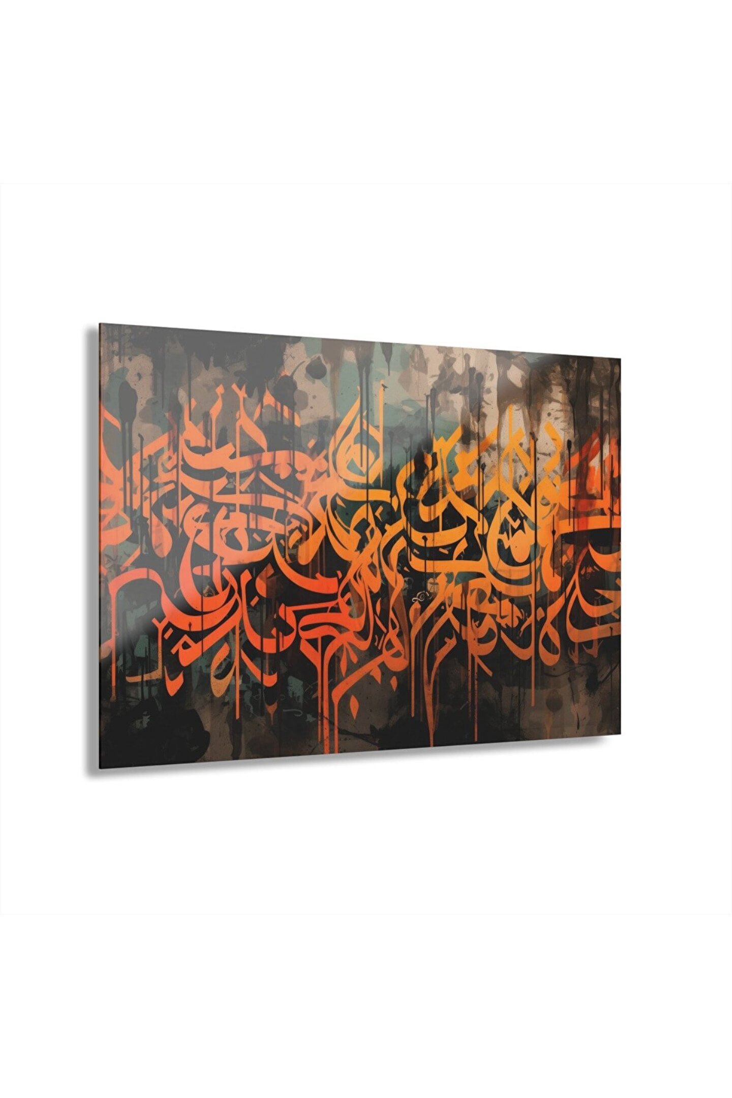 LEYLASER Sulu Boya Efektli Turuncu Arapça Yazı Kuran-ı Kerim İslam Cam Tablo Duvar Dekoru